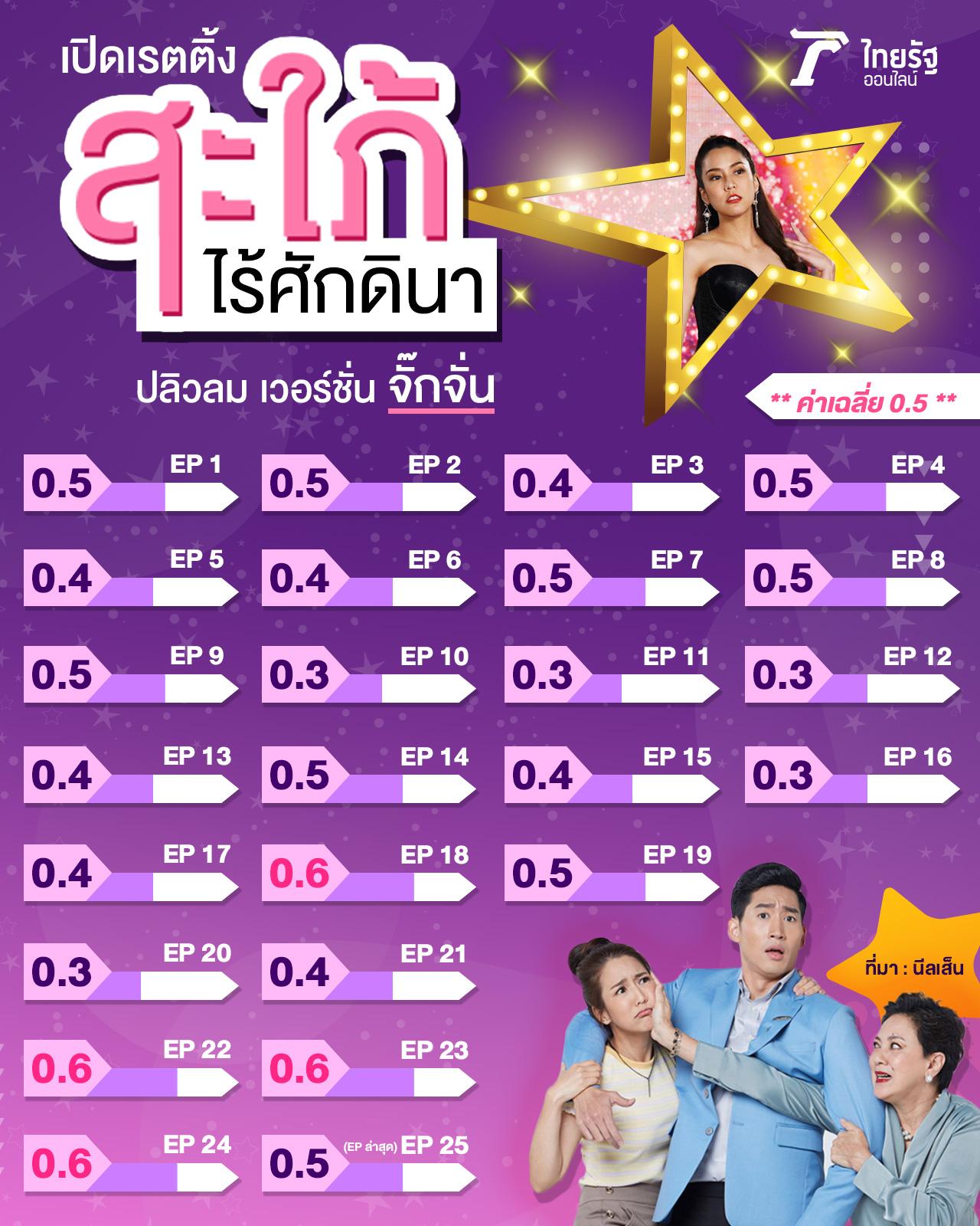 และเมื่อหันมามองทางเรตติ้ง สะใภ้ไร้ศักดินา ขณะที่เขียนนี่ฉายไปแล้ว 25 ตอน เรตติ้งทั้งหมดขมวดเฉลี่ยอยู่ที่ 0.5 แม้เรตติ้งอาจจะไม่เปรี้ยงเยอะเท่าที่ช่อง 8 ทำได้กับ สาปกระแส ที่ตอนจบพุ่งขึ้นไปถึง 3.5 แต่การที่ดันให้เพลง ตำโป๊ก ติดหูได้ก็ต้องถือเป็นความสำเร็จที่ช่อง 8 ทำได้