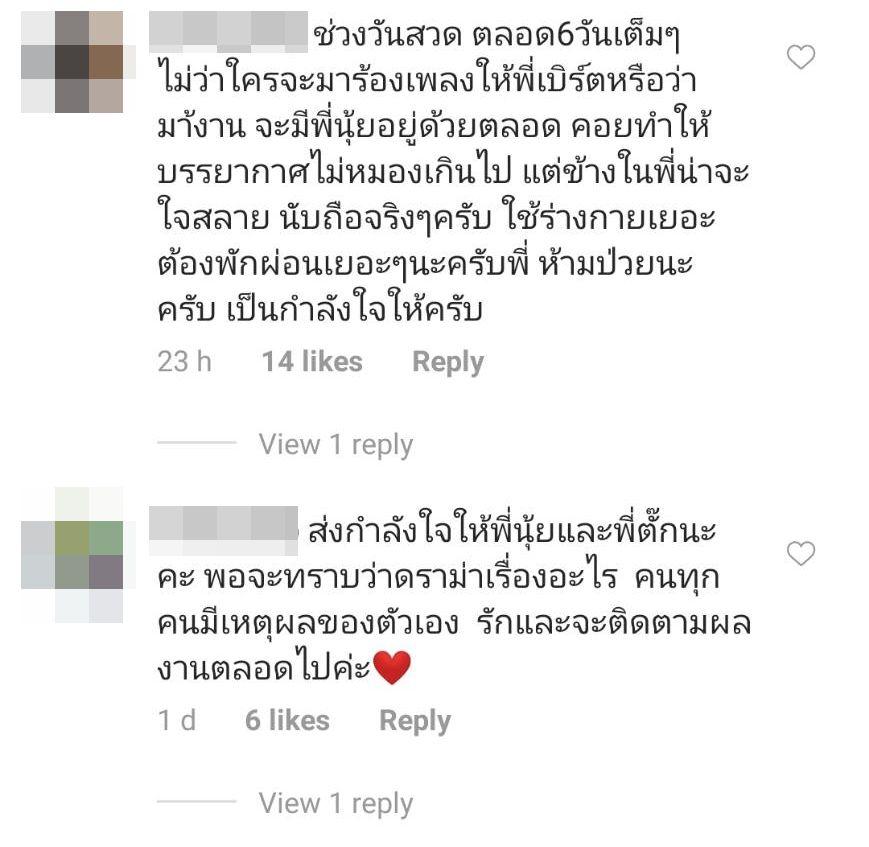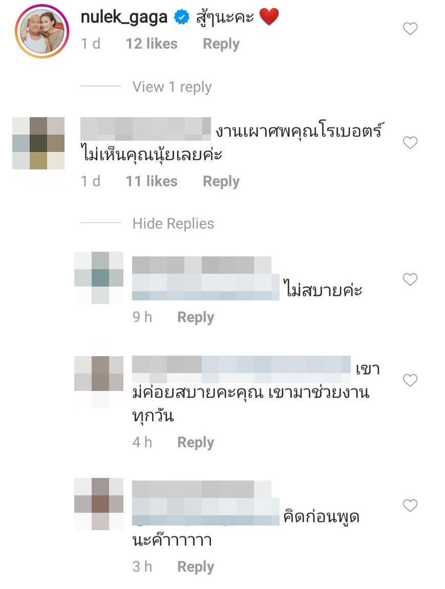 โดยมีแฟนๆ เข้ามาคอมเมนต์ให้กำลังใจ พร้อมทั้งอวยพรขอให้หายป่วยไวๆ แต่ก็ยังมีบางคนที่เข้ามาคอมเมนต์ถามว่าทำไมไม่เห็นนุ้ยในงานฌาปนกิจศพโรเบิร์ต และมีชาวเน็ตเข้ามาคอมเมนต์ตอบแทนว่านุ้ยไม่สบายด้วย.