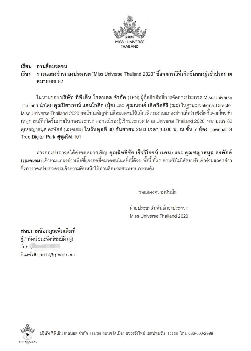 ในนามของ บริษัท ทีพีเอ็น โกลบอล จำกัด (TPN) ผู้ถือลิขสิทธิ์การจัดการประกวด Miss Universe Thailand นำโดย คุณปิยาภรณ์ แสนโกศิก (ปุ้ย) และ ณะ ณรงค์ เลิศกิตศิริ (ณะ) ในฐานะ National Director Miss Universe Thailand 2020 ขอเรียนเชิญท่านสื่อมวลชนให้เกียรติร่วมงานแถลงข่าวเพื่อรับฟังข้อชี้แจงเกี่ยวกับเหตุการณ์ที่เกิดขึ้นภายในกองประกวด ต่อกรณีของผู้เข้าประกวด Miss Universe Thailand 2020 หมายเลข 82 คุณชญาธนุส ศรทัตต์ (เฌอเอม) ในวันพุธที่ 30 กันยายน 2563 เวลา 13.00 น. ณ ชั้น 7 ห้อง Townhall S True Digital Park สุขุมวิท 101