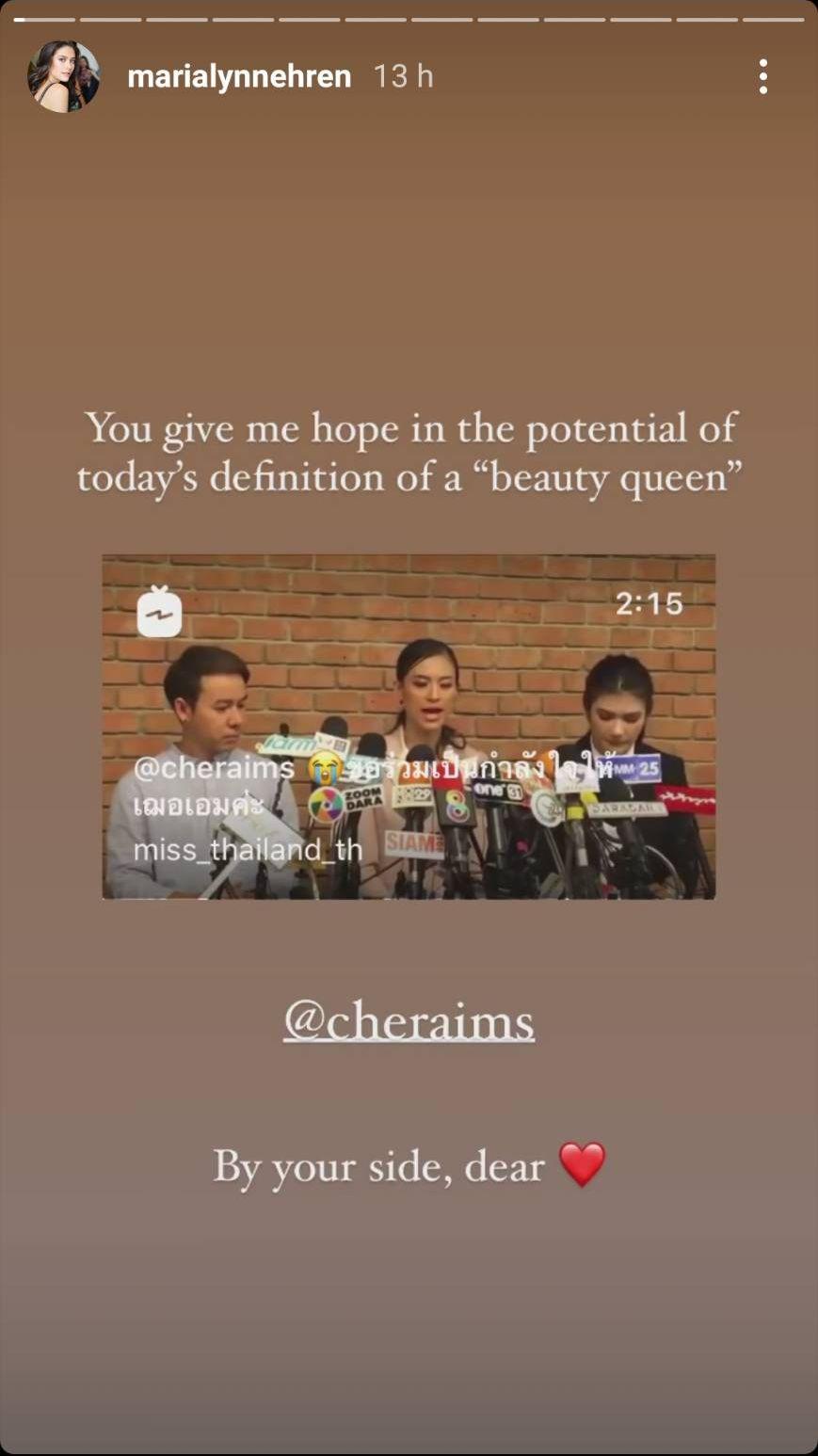 และล่าสุด รุ่นพี่นางงามอย่าง มารีญา พูลเลิศลาภ มิสยูนิเวิร์สไทยแลนด์ 2020 ก็ได้โพสต์คลิปการแถลงข่าวลงไอจีสตอรี่ พร้อมทั้งเขียนแคปชั่น “You give me hope in the potential of today’s definition of a “beauty queen” @cheraims By your side, dear” และใส่อีโมจิรูปหัวใจ