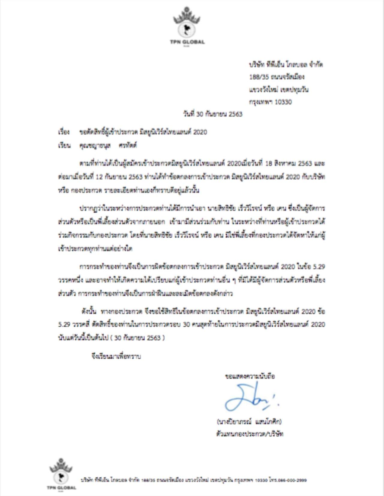 ดังนั้น ทางกองประกวด จึงขอใช้สิทธิ์ในข้อตกลงการเข้าประกวด มิสยูนิเวิร์สไทยแลนด์ 2020 ข้อ 5.29 วรรคสี่ ตัดสิทธิ์ของท่านในการประกวดรอบ 30 คนสุดท้ายในการประกวดมิสยูนิเวิร์สไทยแลนด์ 2020 นับแต่วันนี้เป็นต้นไป (30 กันยายน 2563)