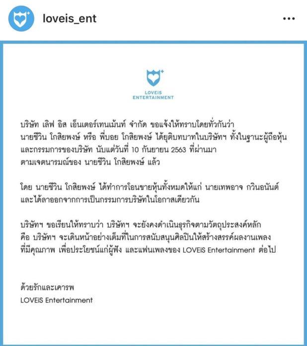 “บริษัท เลิฟ อิส เอ็นเตอร์เทนเม้นท์ จำกัด ขอแจ้งให้ทราบโดยทั่วกันว่า นายชีวิน โกสิยพงษ์ หรือ พี่บอย โกสิยพงษ์ ได้ยุติบทบาทในบริษัทฯ ทั้งในฐานะผู้ถือหุ้นและกรรมการบริษัท นับแต่วันที่ 10 กันยายน 2563 ที่ผ่านมา ตามเจตนารมณ์ของ นายชีวิน โกสิยพงษ์ แล้ว