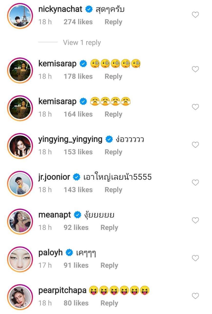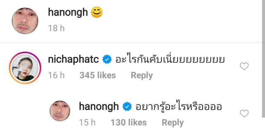 ทำเอาคอมเมนต์ในไอจีต่างแซวกันยกใหญ่ว่าน่ารัก กรี๊ดกันเต็มไอจี พร้อมทั้งปาอีโมจิหัวใจให้รัวๆ เลยทีเดียว ด้านคนในรูปอย่างแพรวาถึงกับคอมเมนต์ "อะไรกันคับเนี่ยยยยยยยย" และหน่องตอบกลับว่า "อยากรู้อะไรหรืออออ" ด้วย.