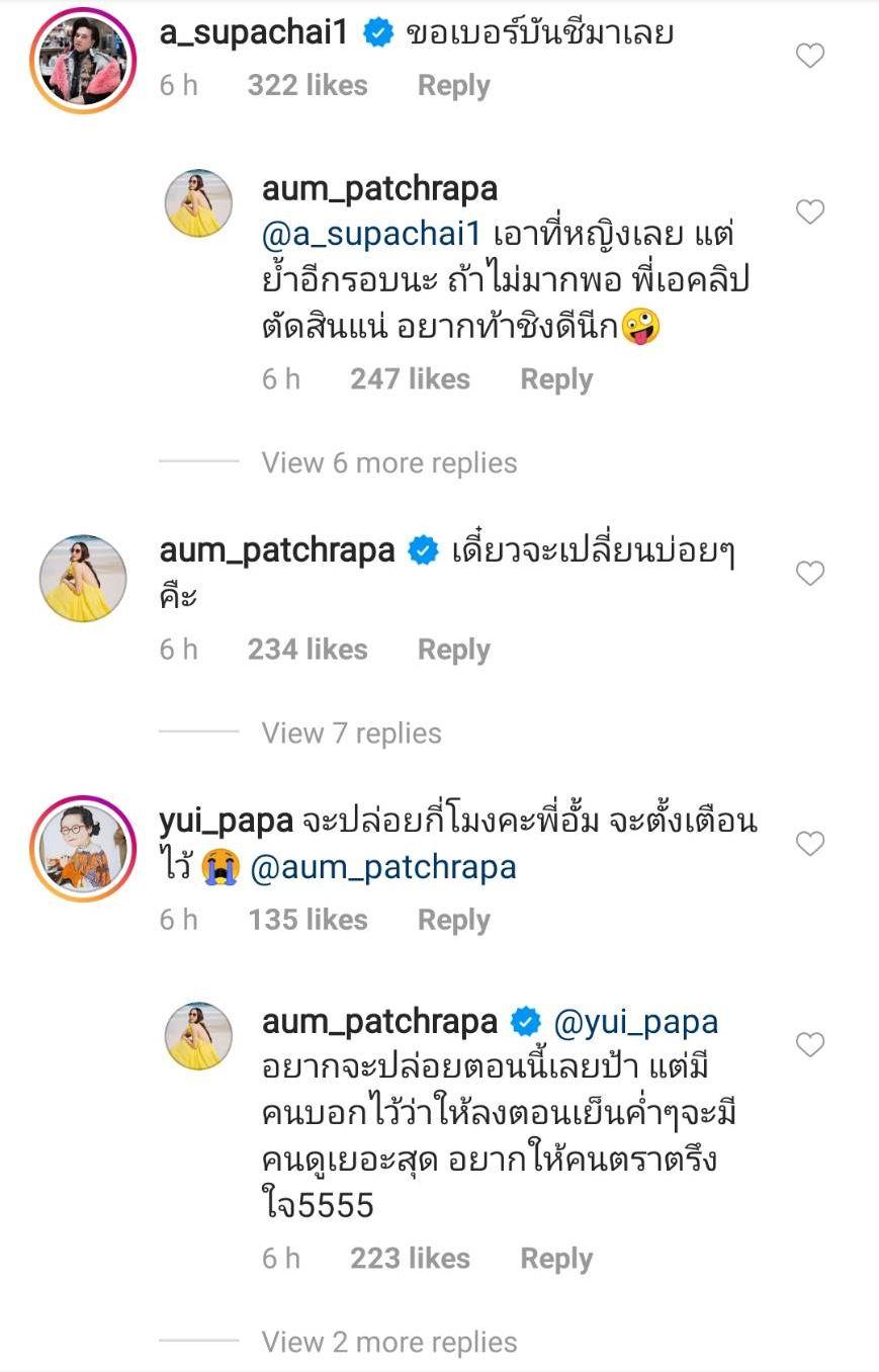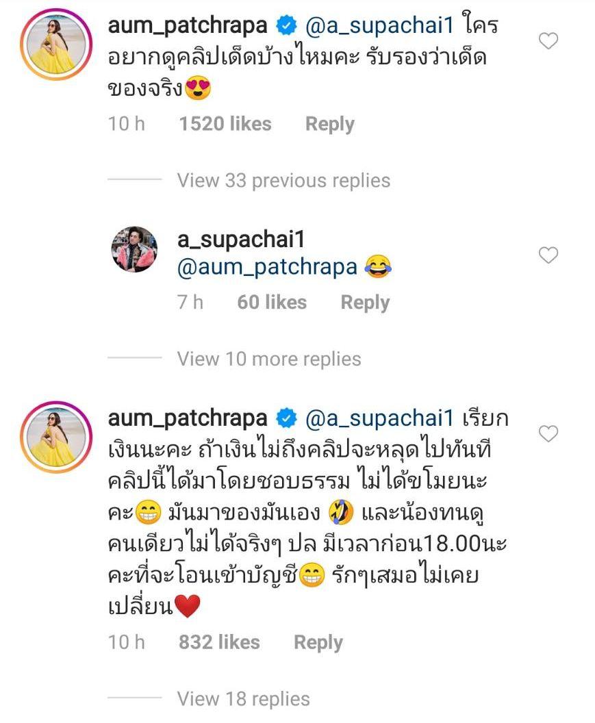 หลังจากนั้นเอก็ได้มาคอมเมนต์ขอเลขบัญชีจากอั้ม แต่ทุกอย่างคงสายไปแล้ว เพราะหลังจาก 18.00 น. อั้มก็ปล่อยคลิปของเอตามสัญญา พร้อมทั้งเขียนแคปชั่นว่า “นี่ใช่ไหมที่เขาเรียกกันว่า “ปังปุริเย่” ปังปังปัง ขอให้เย็นวันนี้เป็นวันที่มีความสุขของทุกคนนะคะ #รักๆพี่เอเสมอไม่เคยเปลี่ยน #ต้อนรับเข้าสู่รอบตัดสิน #พังปุริเย่ @a_supachai1”