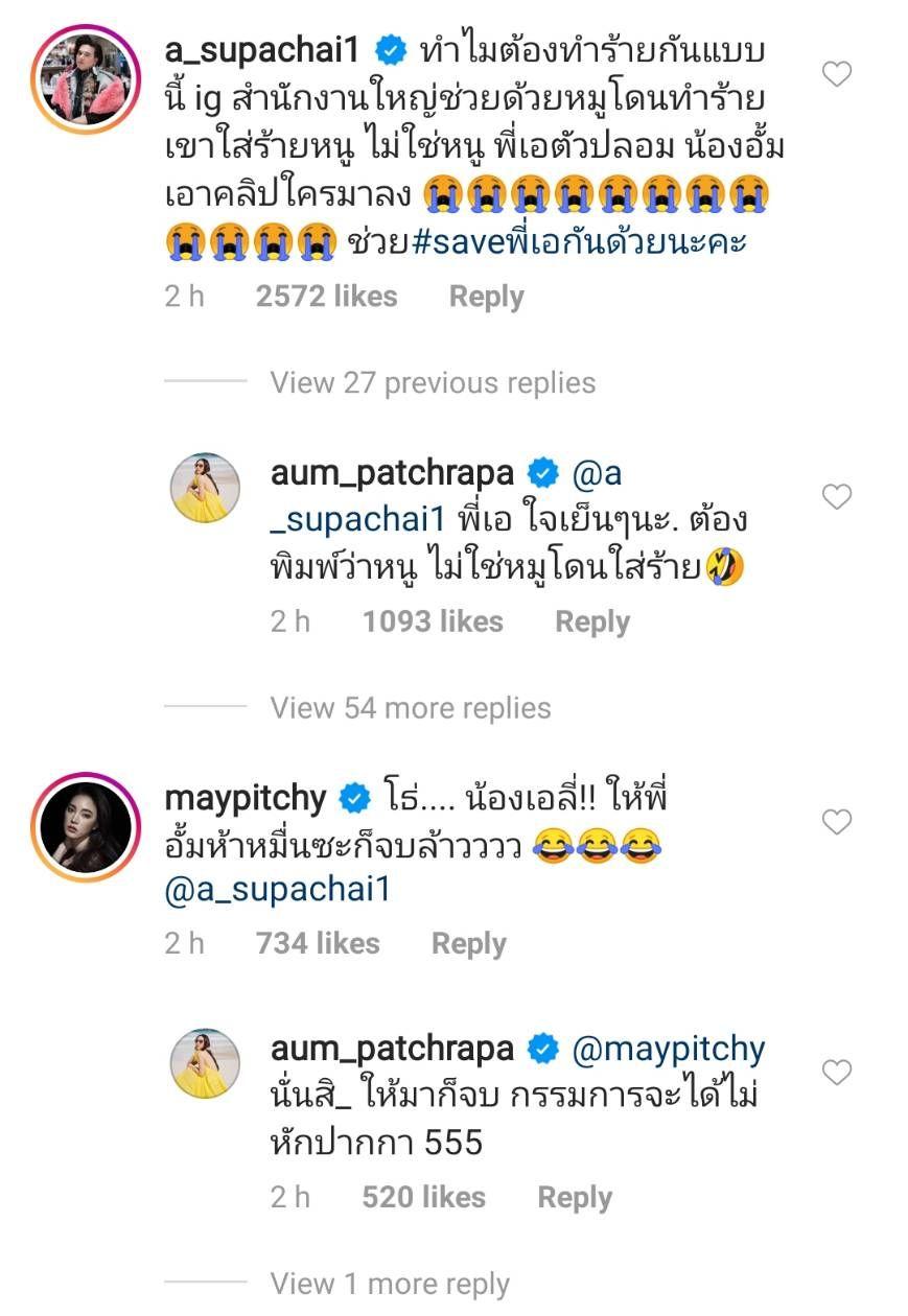 จากนั้นเอก็แคปภาพจากคลิปที่อั้มลงในไอจีมาโพสต์และพิมพ์ข้อความทับรูปบอกว่า “ปลอม!! 5555555555555555 พี่เอตัวปลอมนะคะ!!” พร้อมทั้งชี้แจงว่า “คงจะเป็นการเข้าใจผิดกันนะคะ น่าจะเป็นพี่เอตัวปลอมเพราะพี่เอตัวจริงขาจะยาวผิวจะสวยดั่งหยวกกล้วย คนนี้หันหลังน่าจะไม่ใช่พี่เอนะคะ 5555555555555555 @aum_patchrapa”