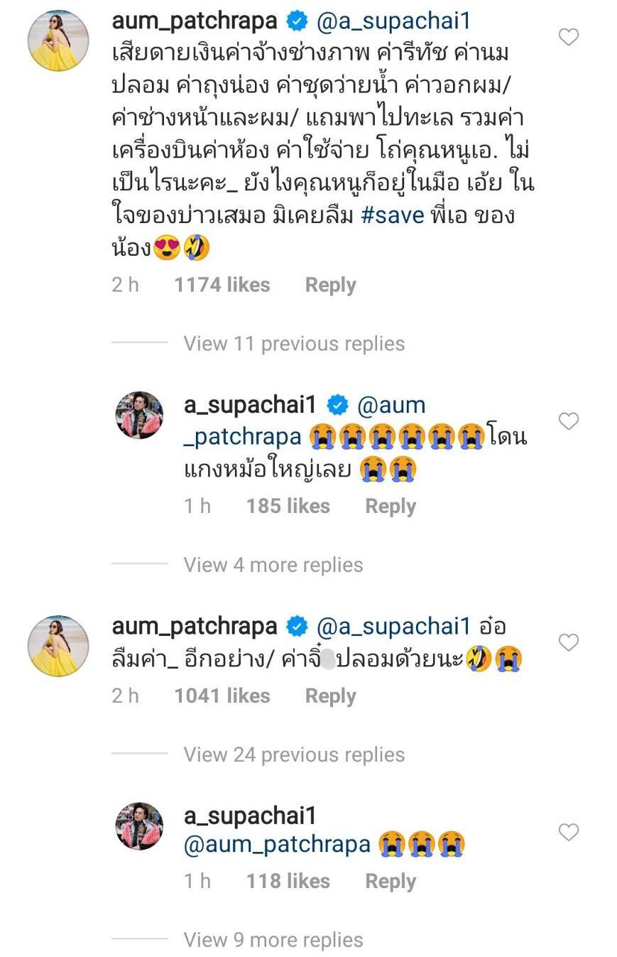 แต่สาวอั้มก็ไม่ยอมแพ้ เข้ามาคอมเมนต์แซวยับ โดยบอกว่า “เสียดายเงินค่าจ้างช่างภาพ ค่ารีทัช ค่านมปลอม ค่าถุงน่อง ค่าชุดว่ายน้ำ ค่าวอกผม/ ค่าช่างหน้าและผม/ แถมพาไปทะเล รวมค่าเครื่องบินค่าห้อง ค่าใช้จ่าย โถ่คุณหนูเอ. ไม่เป็นไรนะคะ_ ยังไงคุณหนูก็อยู่ในมือ เอ้ย ในใจของบ่าวเสมอ มิเคยลืม #save พี่เอ ของน้อง” และคอมเมนต์เพิ่มอีกว่า “อ๋อ ลืมค่า_ อีกอย่าง/ ค่าจิ๋_ปลอมด้วยนะ” ทำเอาแฟนๆ แห่กดไลค์และแซวกันหนักมากเลยทีเดียว.