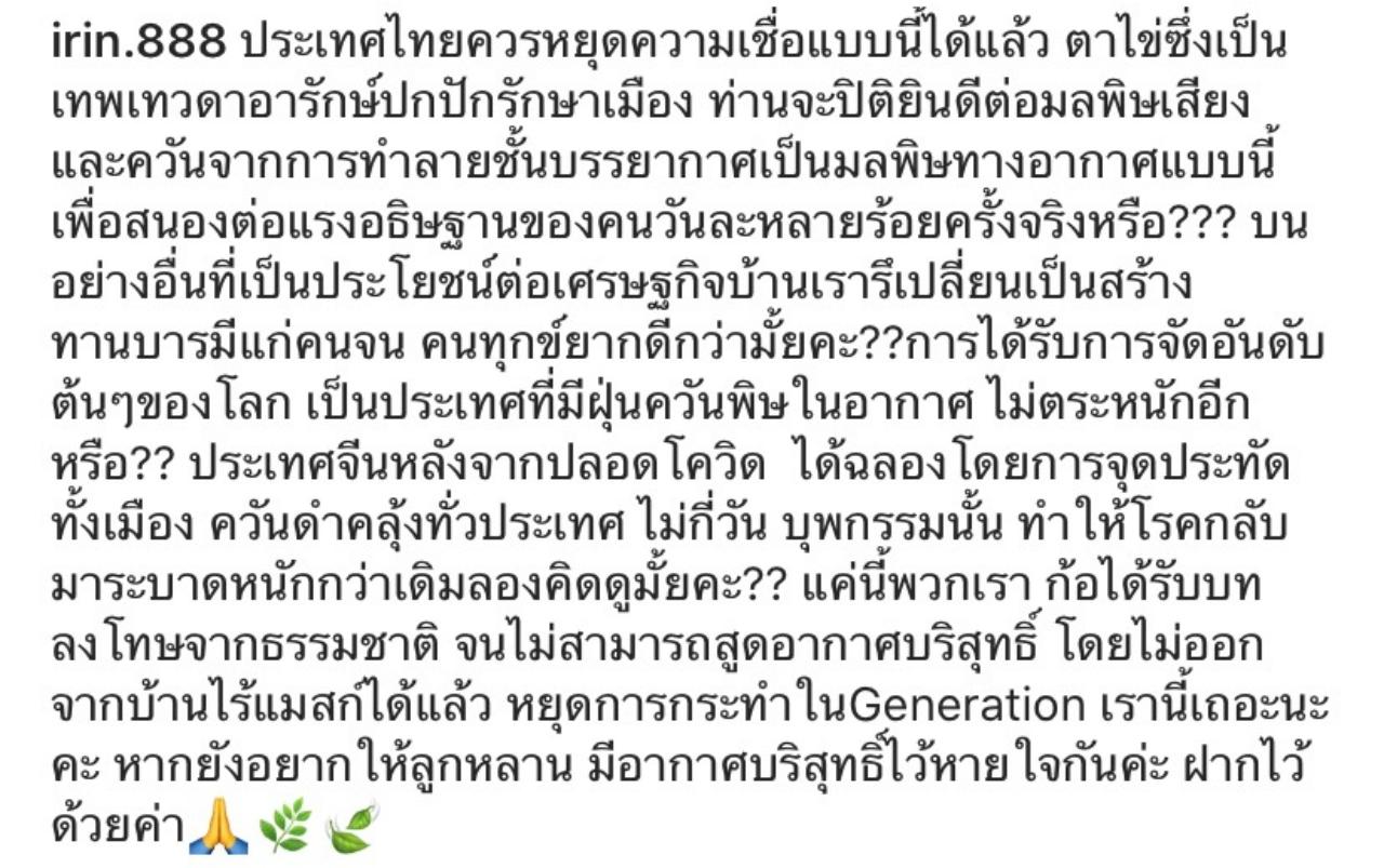 ทำเอาสาวเซ็กซี่ เปิ้ล ไอริณ ศรีแกล้ว ถึงกับเกิดคำถามขึ้น หลังจากที่ได้เห็นภาพควันดำในระหว่างที่คนไปจุดประทัดแก้บนให้ตาไข่ ด้วยความเชื่อและศรัทธาเต็มหัวใจ แต่งานนี้สาวเซ็กซี่กลับไม่เห็นด้วยกับการทำแบบนี้ และโพสต์รูปพร้อมแคปชั่นผ่านอินสตาแกรมของตัวเองว่า
