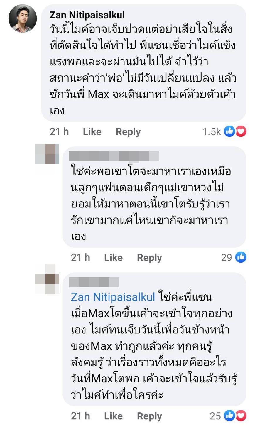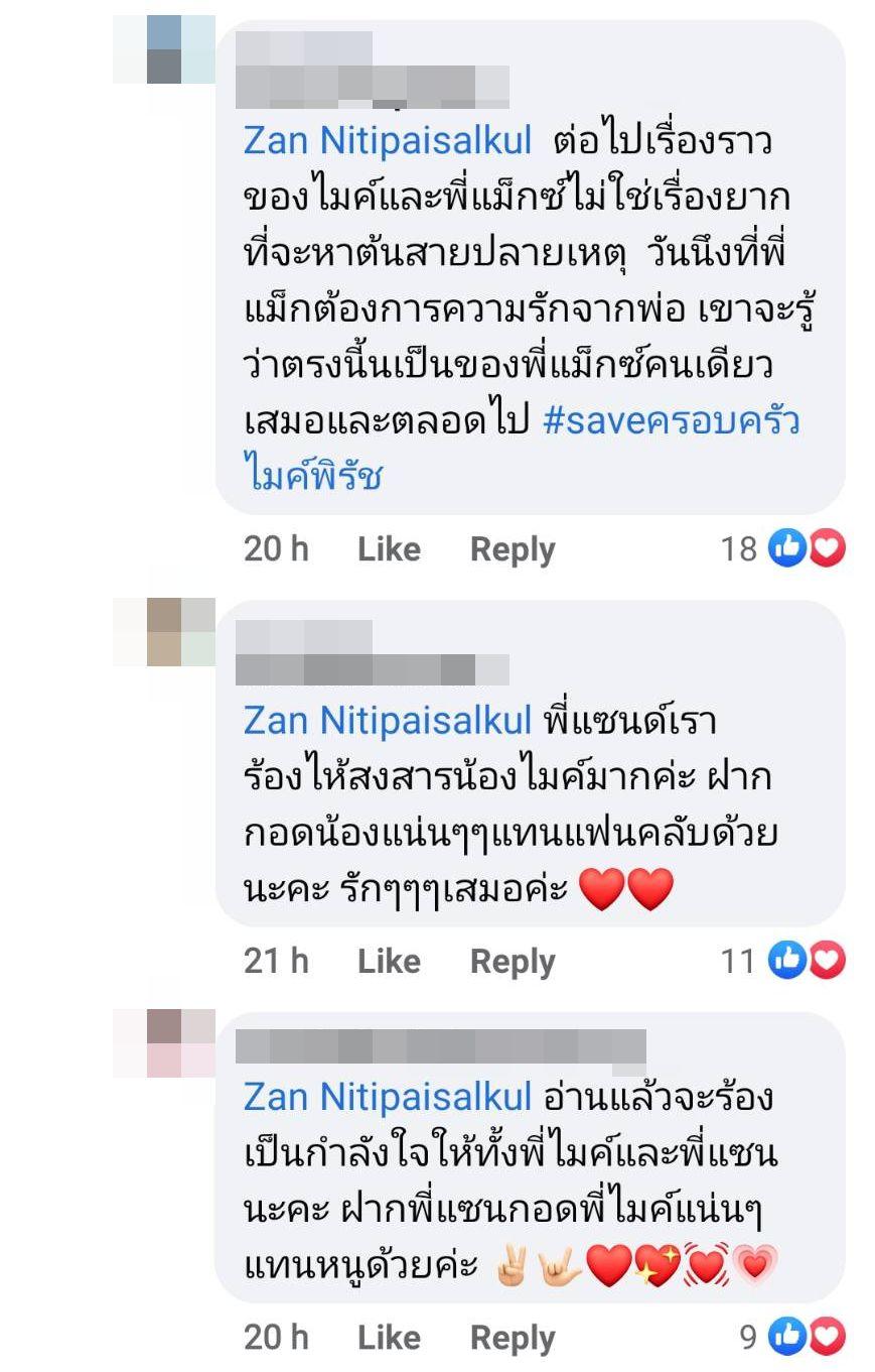 จากนั้นก็มีชาวเน็ตกดไลค์และแสดงความคิดเห็นเป็นจำนวนมาก พร้อมทั้งให้กำลังใจไมค์ แซน และครอบครัวด้วย.