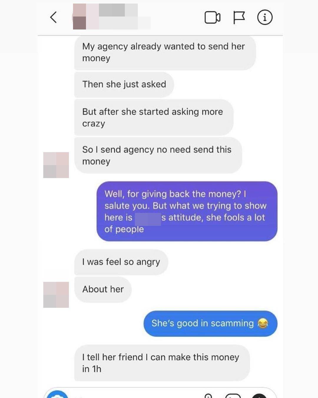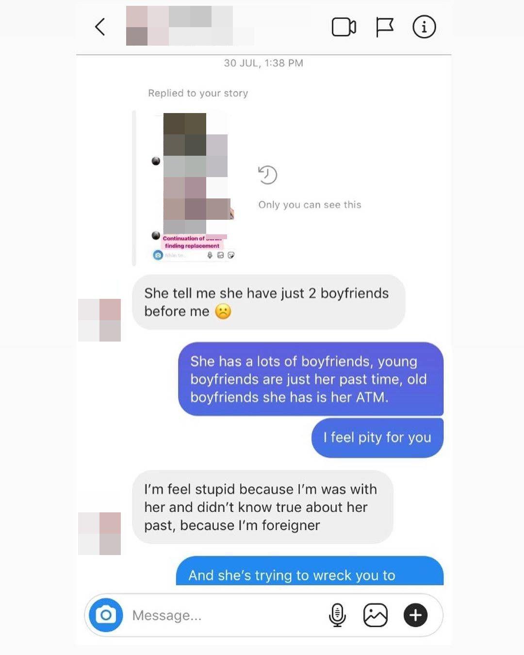 นอกจากนี้ยังมีข้อความที่ชายหนุ่มบอกอีกว่า “เขาบอกผมว่ามีแฟนเก่าแค่ 2 คนก่อนจะมาเจอผม ผมรู้สึกโง่เพราะผมเคยอยู่กับเขา และไม่เคยรู้เรื่องอดีตของเขาเลย เพราะผมเป็นคนต่างชาติ เอเจนซี่ของผมส่งเงินให้เขา จากนั้นเขามาขอเงินอีก ผมเลยบอกเอเจนซี่ว่าไม่ต้องส่งเงินให้อีก ผมรู้สึกโกรธเกี่ยวกับเขา ผมบอกเพื่อนเขาว่าผมสามารถหาเงินจำนวนนี้ได้ภายใน 1 ชม. ปัญหามันไม่ได้อยู่ที่เงินหรอก แต่ปัญหาอยู่ที่เขา ผมรู้สึกขยะแขยงเขามากกว่า”
