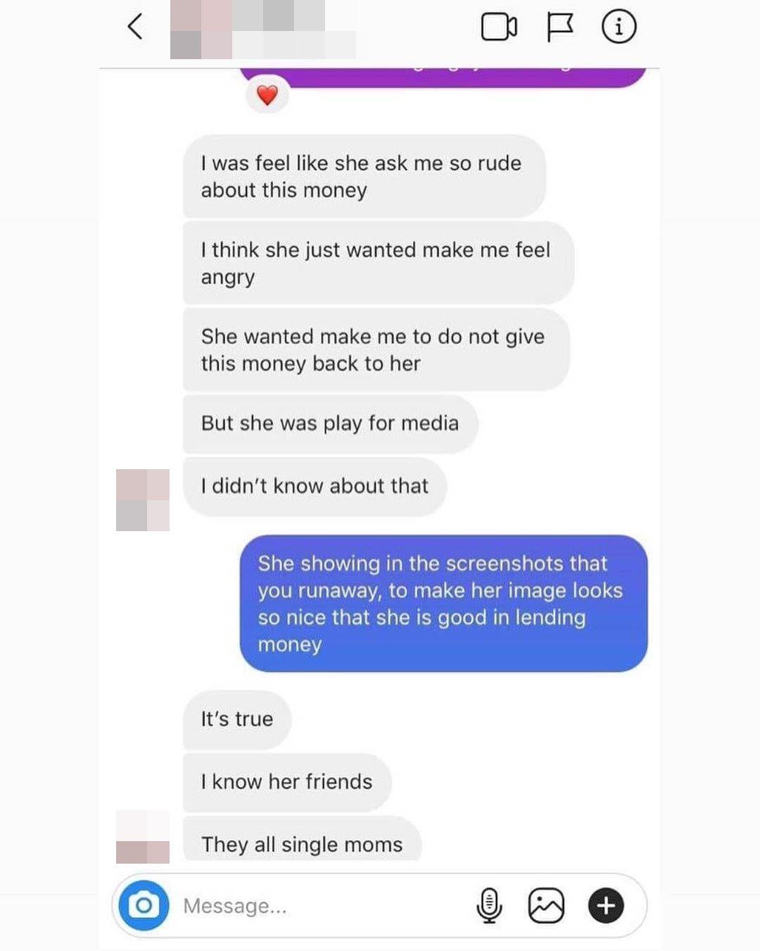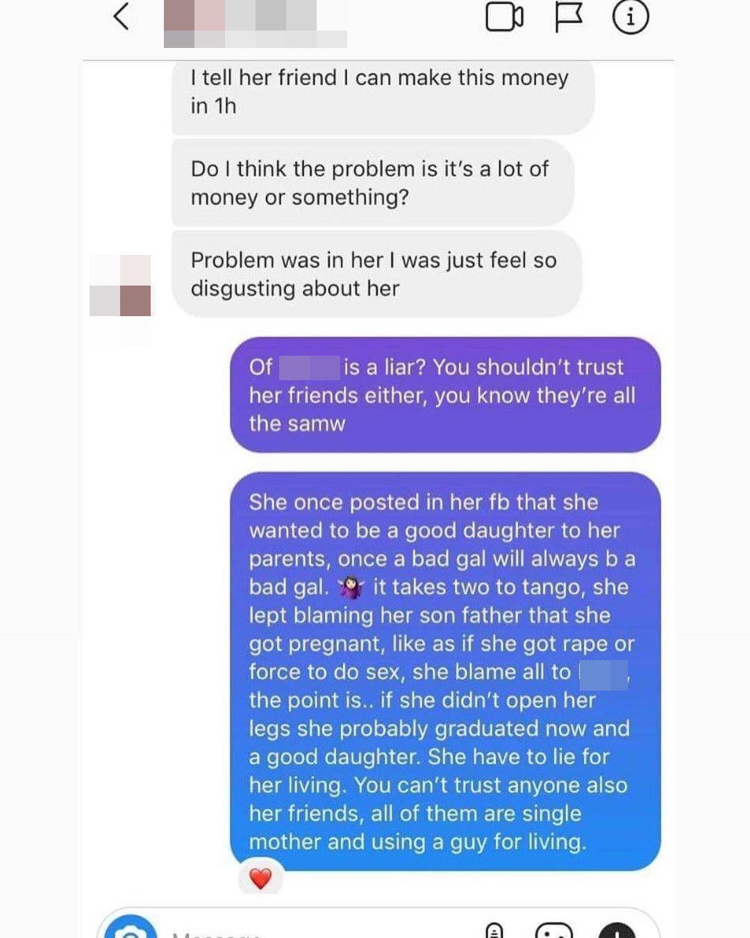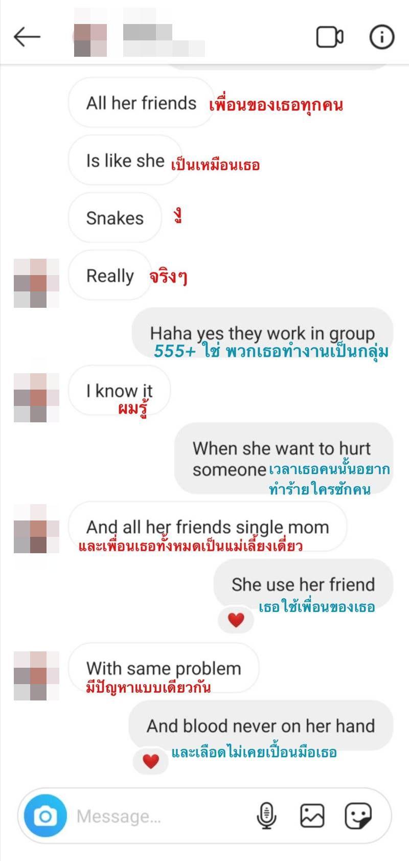 จากนั้นก็มีข้อความของชายหนุ่มเขียนอีกว่า “เพื่อนของเธอทุกคนเป็นเหมือนเธอ งูจริงๆ” และชาวเน็ตคนดังกล่าวบอกว่า “ฮ่าๆ ใช่ พวกเธอทำงานเป็นกลุ่ม” ชายหนุ่มตอบ “ผมรู้ และเพื่อนเธอทั้งหมดเป็นแม่เลี้ยงเดี่ยว มีปัญหาแบบเดียวกัน” และชาวเน็ตคนดังกล่าวบอกว่า “เวลาเธอคนนั้นอยากทำร้ายใครสักคน เธอใช้เพื่อนของเธอ และเลือดไม่เคยเปื้อนมือเธอ”