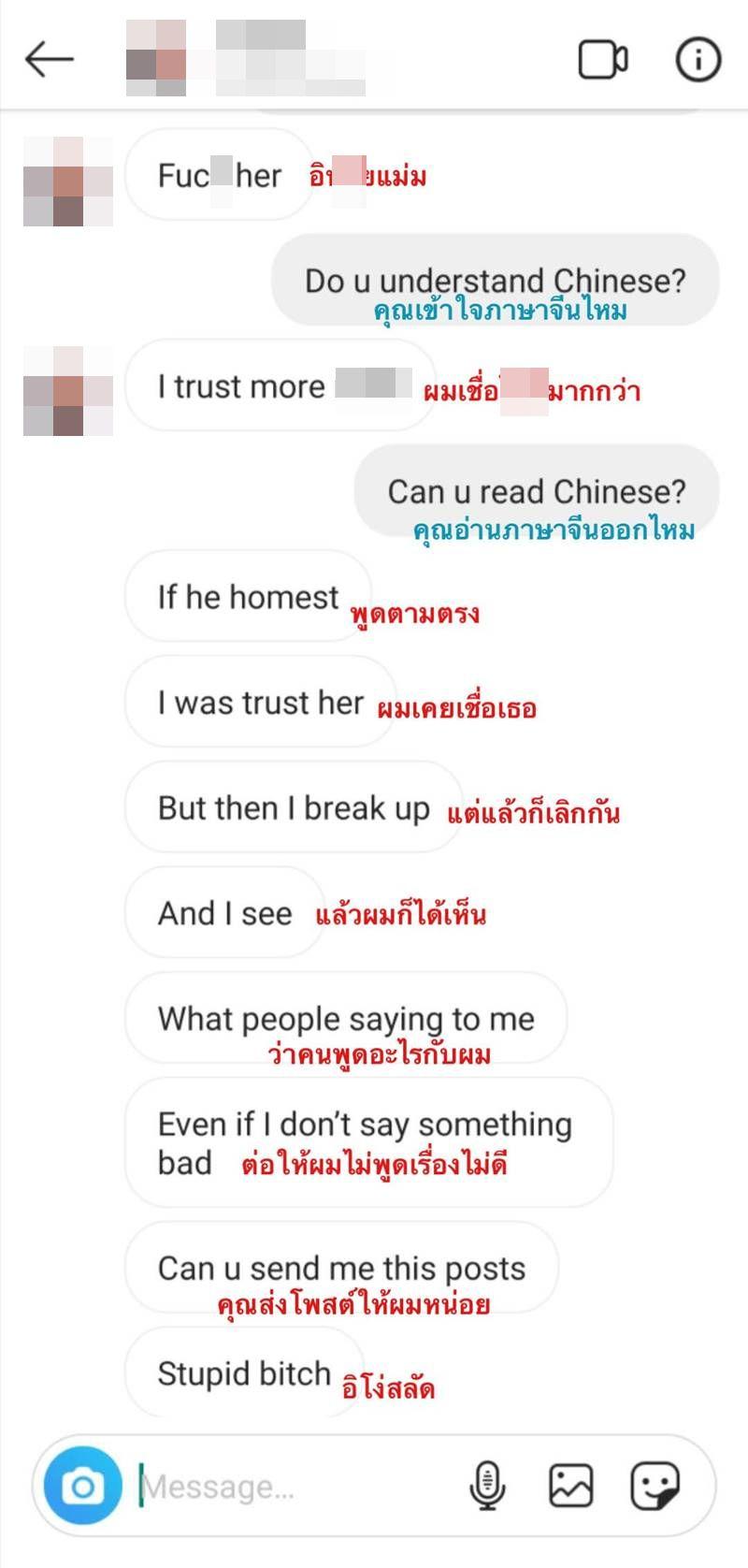 ชายหนุ่มคนดังกล่าวโพสต์คำด่า “Fuc... her” ก่อนจะบอกอีกว่า “ฉันเชื่อ...มากกว่า พูดตามตรง ผมเคยเชื่อเธอ แต่แล้วก็เลิกกัน แล้วผมก็ได้เห็นว่าคนพูดอะไรกับผม ต่อให้ผมไม่พูดเรื่องไม่ดี คุณส่งโพสต์ให้ผมหน่อย” และโพสต์คำหยาบคายอีกว่า “Stupid bitc...”