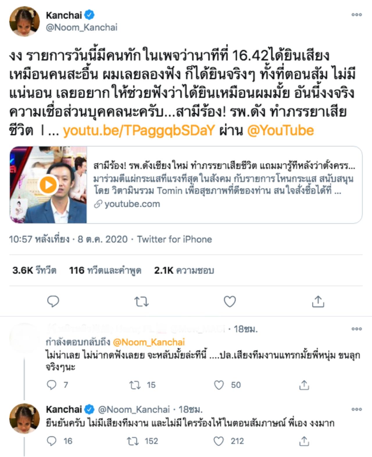 "ขอบคุณหลากหลายความเห็นจากทวีตที่แล้วนะครับ มีทั้งเสียงเก้าอี้ ไมค์ถูเสื้อ มือถูกระจก เสียงสะอื้น และต้องขอโทษที่ทำให้บางท่านกลัวด้วยน้า ไม่ได้ตั้งใจให้กลัว พอดีในเฟซกับทูป มีคนมาเมนต์ไว้เยอะ ผมเลยสงสัยว่าคือเสียงอะไร เลยเข้ามาถาม ลืมคิดว่ามันห้าทุ่มกว่าแล้วอ่ะ"