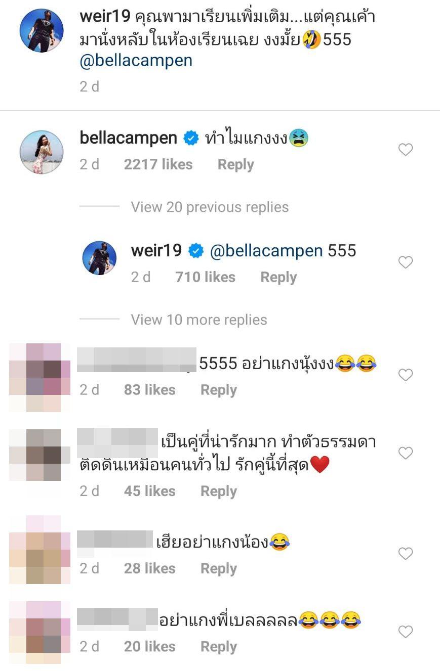 ด้านคนในรูปที่ถูกแกล้งอย่างเบลล่าถึงกับคอมเมนต์ถามเวียร์ว่า “ทำไมแกงงง” และใส่อีโมจิหน้าเหวอๆ เพราะโดนแกล้ง ก่อนที่เวียร์จะตอบกลับ “555” จากนั้นแฟนๆ แซวว่าอย่าแกงน้อง เฮียอย่าพลาดนะ เจอแกงกลับแน่ บ้างก็ชมเป็นคู่ที่น่ารักมาก ทำตัวธรรมดาติดดินเหมือนคนทั่วไป ฯลฯ