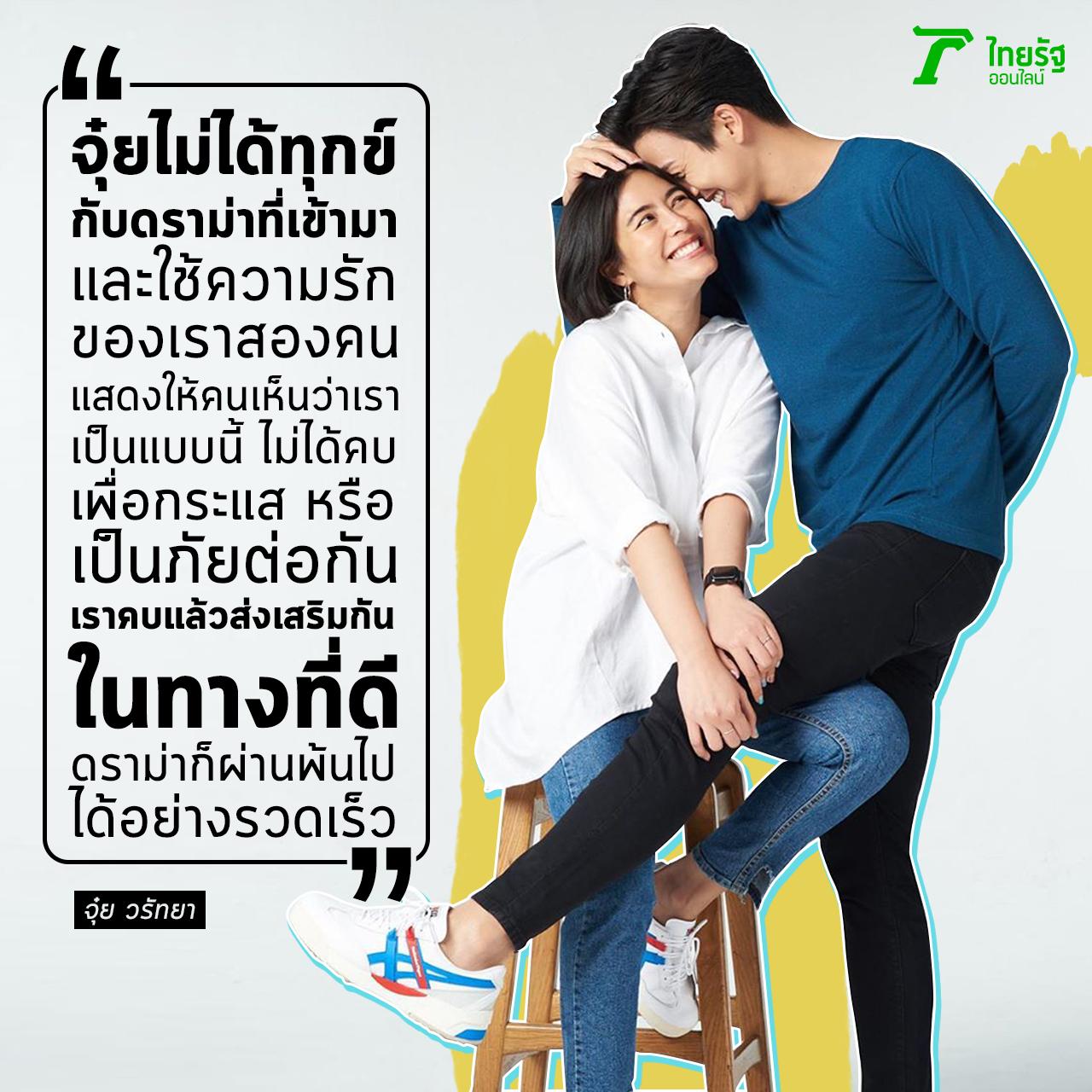 และจุ๋ยไม่ทุกข์กับดราม่าที่เข้ามา และใช้ความรักของเราสองคน แสดงให้คนเห็นว่าเราเป็นแบบนี้ ไม่ได้คบเพื่อกระแส หรือเป็นภัยต่อกัน เราคบแล้วส่งเสริมกันในทางที่ดี ดราม่าก็ผ่านพ้นไปได้อย่างรวดเร็ว สิ่งที่ผ่านไปมันก็ดีนะ มีเรื่องราวให้พูดดี (ยิ้ม)"