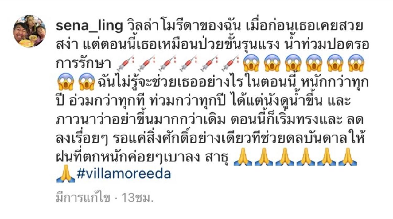 "วิลล่าโมรีดาของฉัน เมื่อก่อนเธอเคยสวยสง่า แต่ตอนนี้เธอเหมือนป่วยขั้นรุนแรง นำ้ท่วมปอดรอการรักษา ฉันไม่รู้จะช่วยเธออย่างไรในตอนนี้ หนักกว่าทุกปี อ่วมกว่าทุกที ท่วมกว่าทุกปี ได้แต่นั่งดูนำ้ขึ้น และภาวนาว่าอย่าขึ้นมากกว่าเดิม ตอนนี้ก็เริ่มทรงและลดลงเรื่อยๆ รอแค่สิ่งศักดิ์สิทธิ์อย่างเดียวที่ช่วยดลบันดาลให้ฝนที่ตกหนักค่อยๆเบาลง สาธุ #villamoreeda"