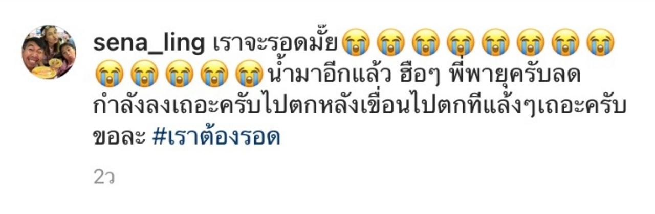 โดย เสนาลิง ได้โพสต์ภาพก่อนที่น้ำป่าจะทะลักเข้าท่วม เป็นน้ำที่ไหลอย่างรุนแรงจนน่ากลัว ซึ่งเจ้าตัวก็ลุ้นอย่างหนักว่าน้ำจะสูงขึ้นจนทะลักท่วมไหม "เราจะรอดมั้ย นำ้มาอีกแล้ว ฮือๆ พี่พายุครับลดกำลังลงเถอะครับไปตกหลังเขื่อนไปตกที่แล้งๆเถอะครับขอละ #เราต้องรอด"