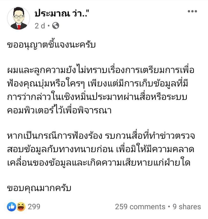 ล่าสุด อ.ประมาณ เลืองวัฒนะวณิช ทนายความของซาร่า ได้โพสต์ชี้แจงถึงประเด็นนี้ไว้ว่า “ขออนุญาตชี้แจงนะครับ ผมและลูกความยังไม่ทราบเรื่องการเตรียมการเพื่อฟ้องคุณบุ๋มหรือใครๆ เพียงแต่มีการเก็บข้อมูลที่มีการว่ากล่าวในเชิงหมิ่นประมาทผ่านสื่อหรือระบบคอมพิวเตอร์ไว้เพื่อพิจารณา หากเป็นกรณีการฟ้องร้อง รบกวนสื่อที่ทำข่าวตรวจสอบข้อมูลกับทางทนายก่อน เพื่อมิให้มีความคลาดเคลื่อนของข้อมูลและเกิดความเสียหายแก่ฝ่ายใด ขอบคุณมากครับ”