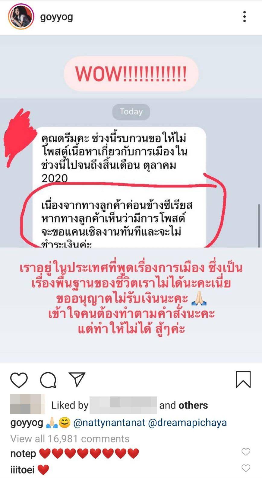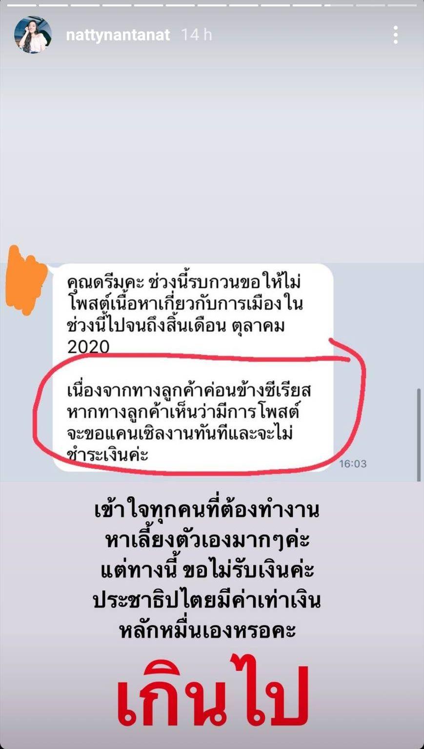 แต่หลังจากนั้น ก้อย-แนตตี้ ได้โพสต์ภาพข้อความแชตสนทนาลงไอจี ซึ่งเป็นข้อความที่ลูกค้ารายหนึ่งส่งมาหา ดรีม โดยบอกว่า “คุณดรีมคะ ช่วงนี้รบกวนขอไม่ให้โพสต์เนื้อหาเกี่ยวกับการเมืองในช่วงนี้ไปจนถึงสิ้นเดือนตุลาคม 2020 เนื่องจากทางลูกค้าค่อนข้างซีเรียส หากทางลูกค้าเห็นว่ามีการโพสต์จะขอแคนเซิลงานทันทีและจะไม่ชำระเงินค่ะ”