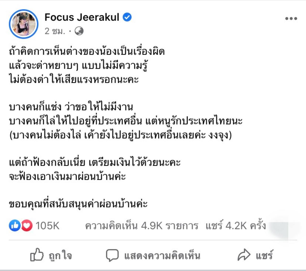 เป็นอีกหนึ่งนักแสดงที่ออกมาแสดงความคิดเห็นทางด้านการเมืองผ่านทางโซเชียลมีเดียของตัวเอง สำหรับ โฟกัส จีระกุล และล่าสุด โฟกัสก็ได้โพสต์ข้อความผ่านทางเฟซบุ๊กของตัวเองอีกครั้งหนึ่ง ซึ่งมีข้อความดังต่อไปนี้
