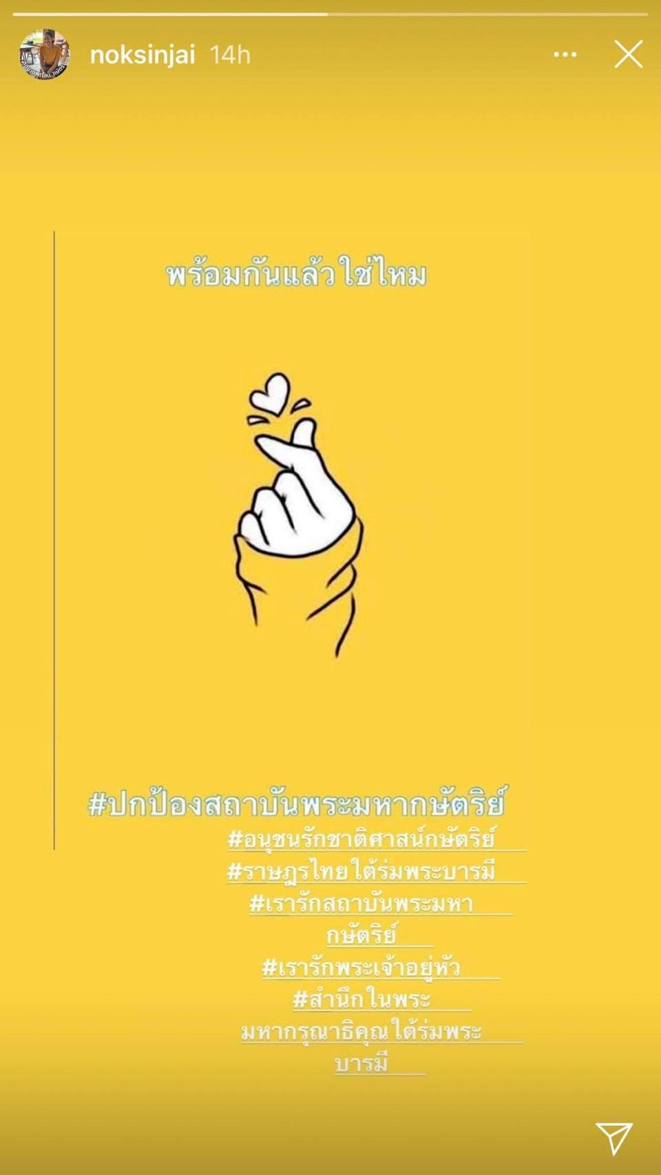 ล่าสุดนักแสดงสาว นก สินจัย เปล่งพานิช ก็ได้โพสต์ภาพลงไอจีสตอรี่ โดยเป็นภาพสีเหลือง มีมือทำมินิฮาร์ท และเขียนข้อความว่า “พร้อมกันแล้วใช่ไหม” พร้อมทั้งติดแฮชแท็ก #ปกป้องสถาบันพระมหากษัตริย์ #อนุชนรักชาติศาสน์กษัตริย์ #ราษฎรไทยใต้ร่มพระบารมี #เรารักสถาบันพระมหากษัตริย์ #เรารักพระเจ้าอยู่หัว #สำนึกในพระมหากรุณาธิคุณใต้ร่มพระบารมี