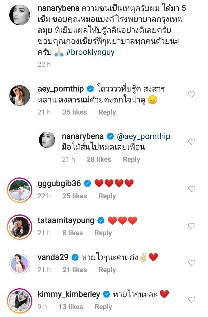 ทำเอาแฟนๆ รวมถึงเพื่อนๆ ในวงการบันเทิงต่างคอมเมนต์ด้วยความเป็นห่วง ด้าน เอ๋ พรทิพย์ คอมเมนต์ถึงหลานชายว่า “โถววววพี่บรู๊ค สงสารหลาน สงสารแม่ด้วย คงตกใจน่าดู” และนานาตอบกลับว่า “มือไม้สั่นไปหมดเลยเพื่อน”.