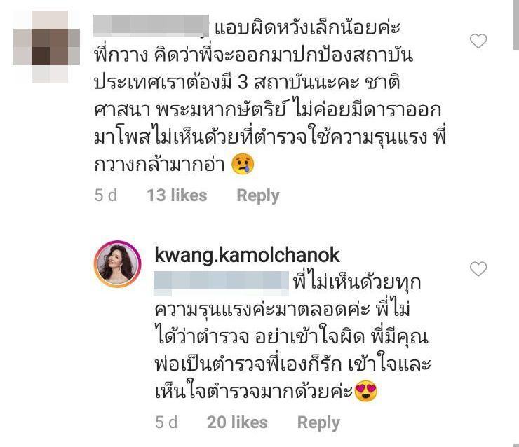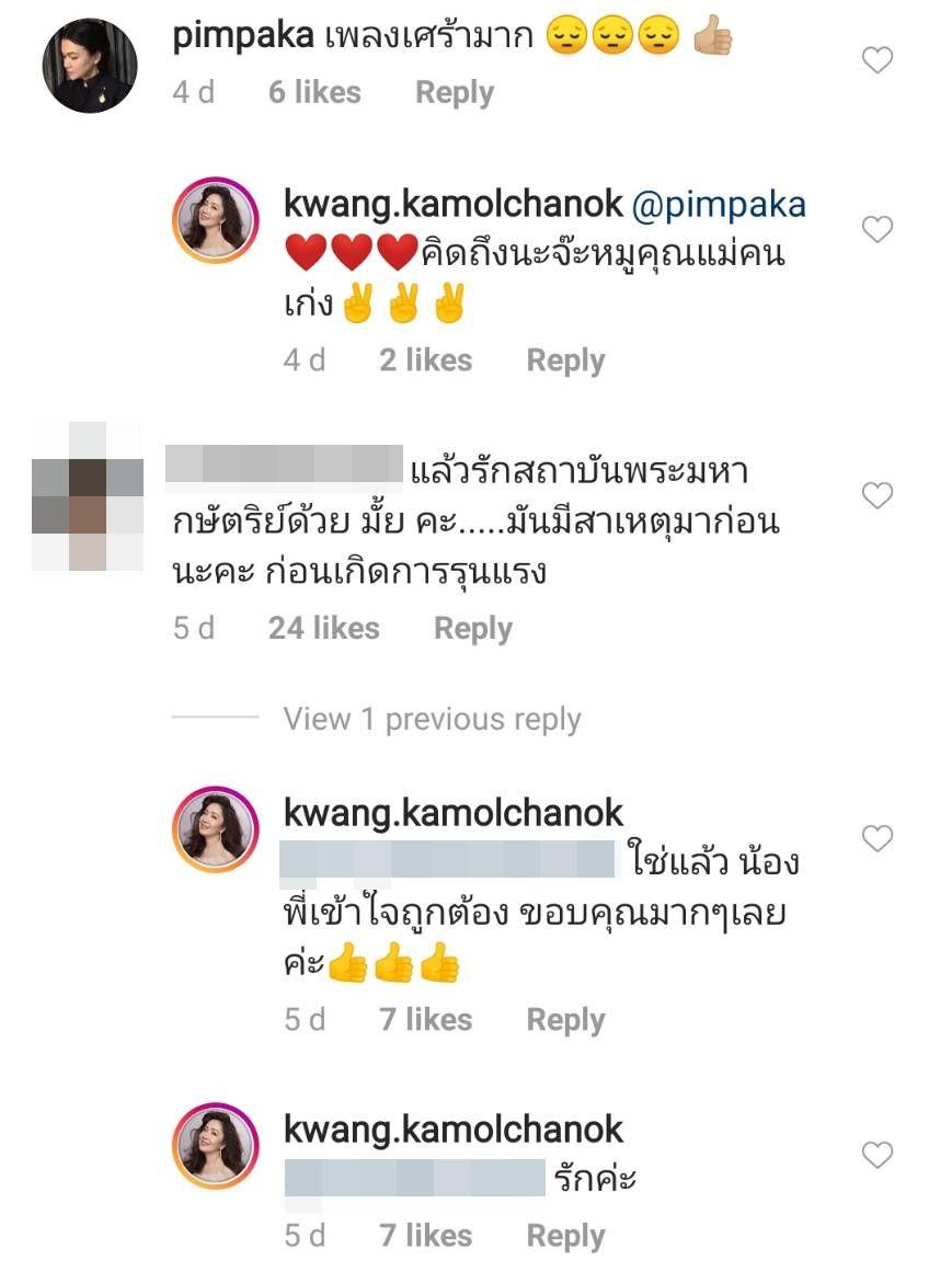 งานนี้มีแฟนๆ เข้ามาคอมเมนต์บอกว่าฟังเพลงนี้แล้วน้ำตาซึม เพลงเพราะมาก พร้อมทั้งปาอีโมจิหัวใจให้รัวๆ แต่ก็มีชาวเน็ตเข้ามาถามว่า "แล้วรักสถาบันพระมหากษัตริย์ด้วยมั้ยคะ.....มันมีสาเหตุมาก่อนนะคะ ก่อนเกิดการรุนแรง" และกวางตอบกลับว่า "รักค่ะ"