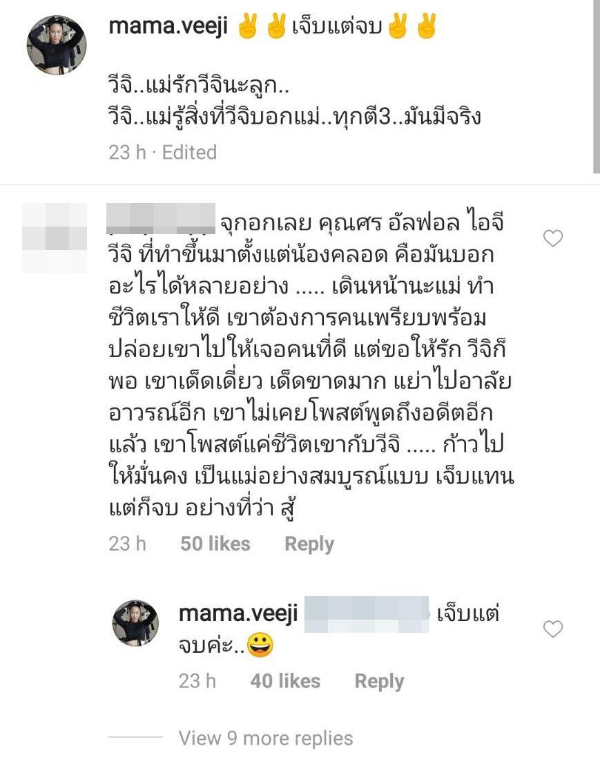 เขาเด็ดเดี่ยว เด็ดขาดมาก อย่าไปอาลัยอาวรณ์อีก เขาไม่เคยโพสต์พูดถึงอดีตอีกแล้ว เขาโพสต์แค่ชีวิตเขากับวีจิ..... ก้าวไปให้มั่นคง เป็นแม่อย่างสมบูรณ์แบบ เจ็บแทน แต่ก็จบ อย่างที่ว่า สู้” และติ๊กก็ได้ตอบกลับว่า “เจ็บแต่จบค่ะ..” พร้อมทั้งใส่อีโมจิรูปยิ้มด้วย.