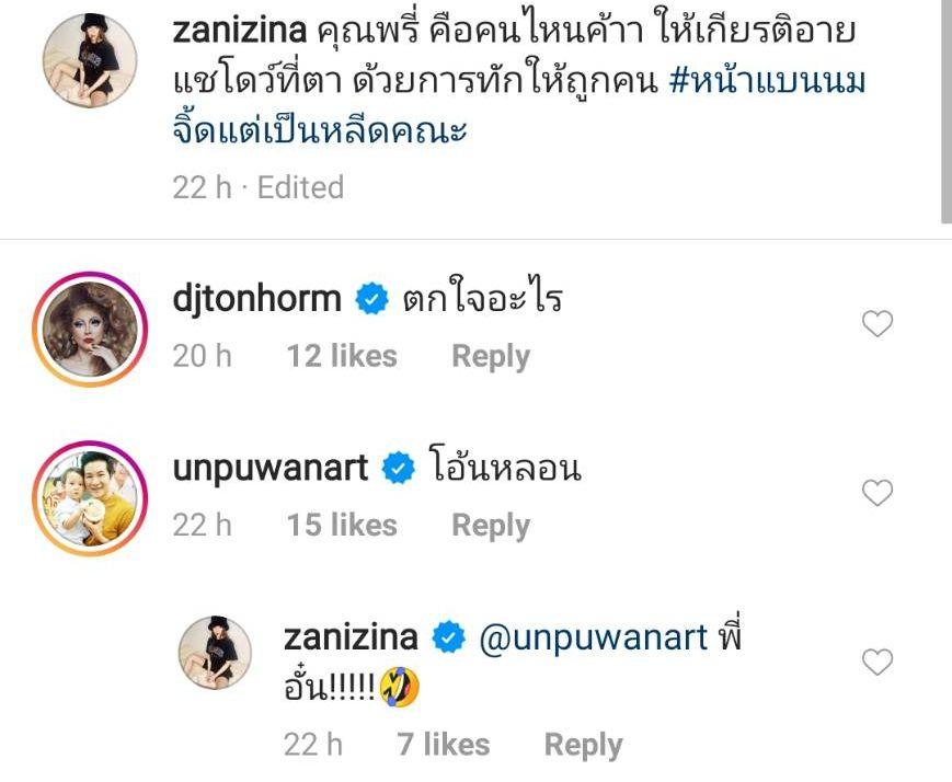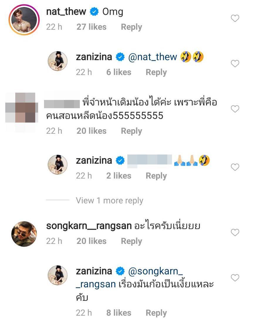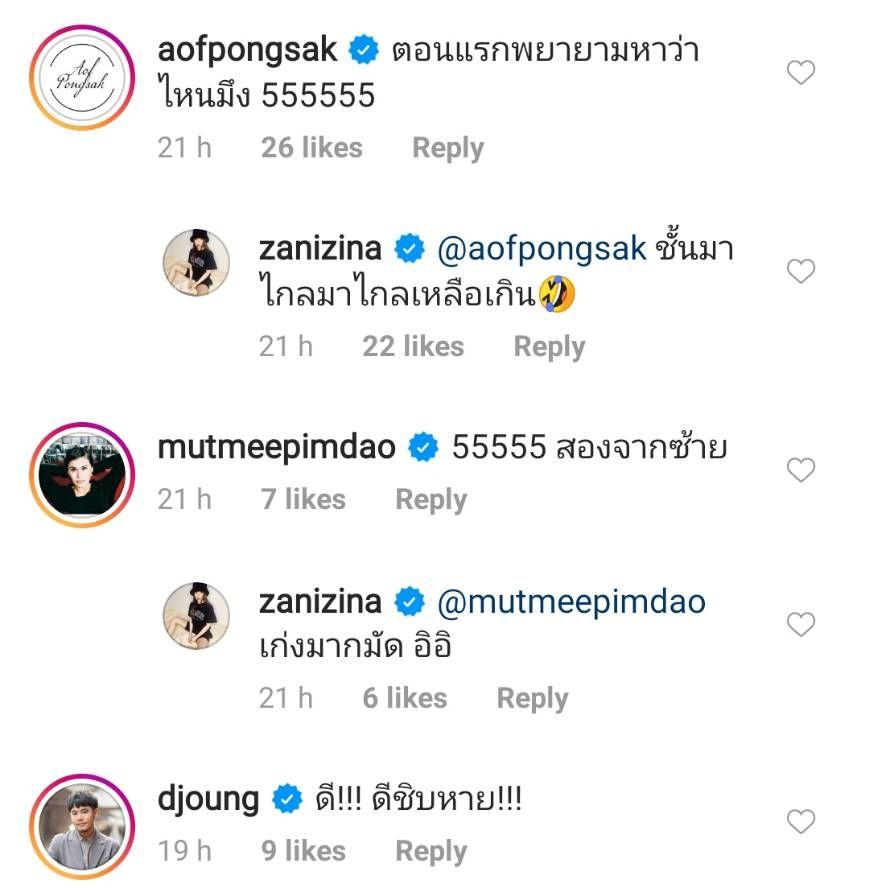 ทำเอาคนบันเทิงตามคอมเมนต์แซวกระหน่ำ อาทิ อ๊อฟ ปองศักดิ์ “ตอนแรกพยายามหาว่าไหนมึง 555555”, อั๋น ภูวนาท “โอ๊ยหลอน”, ดีเจต้นหอม ศกุนตลา “ตกใจอะไร”, สงกรานต์ รังสรรค์ “อะไรครับเนี่ยยย”, มัดหมี่ พิมพ์ดาว “55555 สองจากซ้าย”, ณัฏฐ์ ทิวไผ่งาม "Omg" ฯลฯ