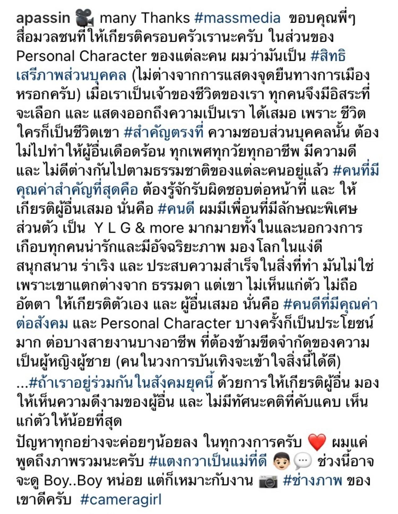 "many Thanks #massmedia ขอบคุณพี่ๆ สื่อมวลชนที่ให้เกียรติครอบครัวเรานะครับ ในส่วนของ Personal Character ของแต่ละคน ผมว่ามันเป็น #สิทธิเสรีภาพส่วนบุคคล (ไม่ต่างจากการแสดงจุดยืนทางการเมืองหรอกครับ) เมื่อเราเป็นเจ้าของชีวิตของเรา ทุกคนจึงมีอิสระที่จะเลือก และแสดงออกถึงความเป็นเราได้เสมอ