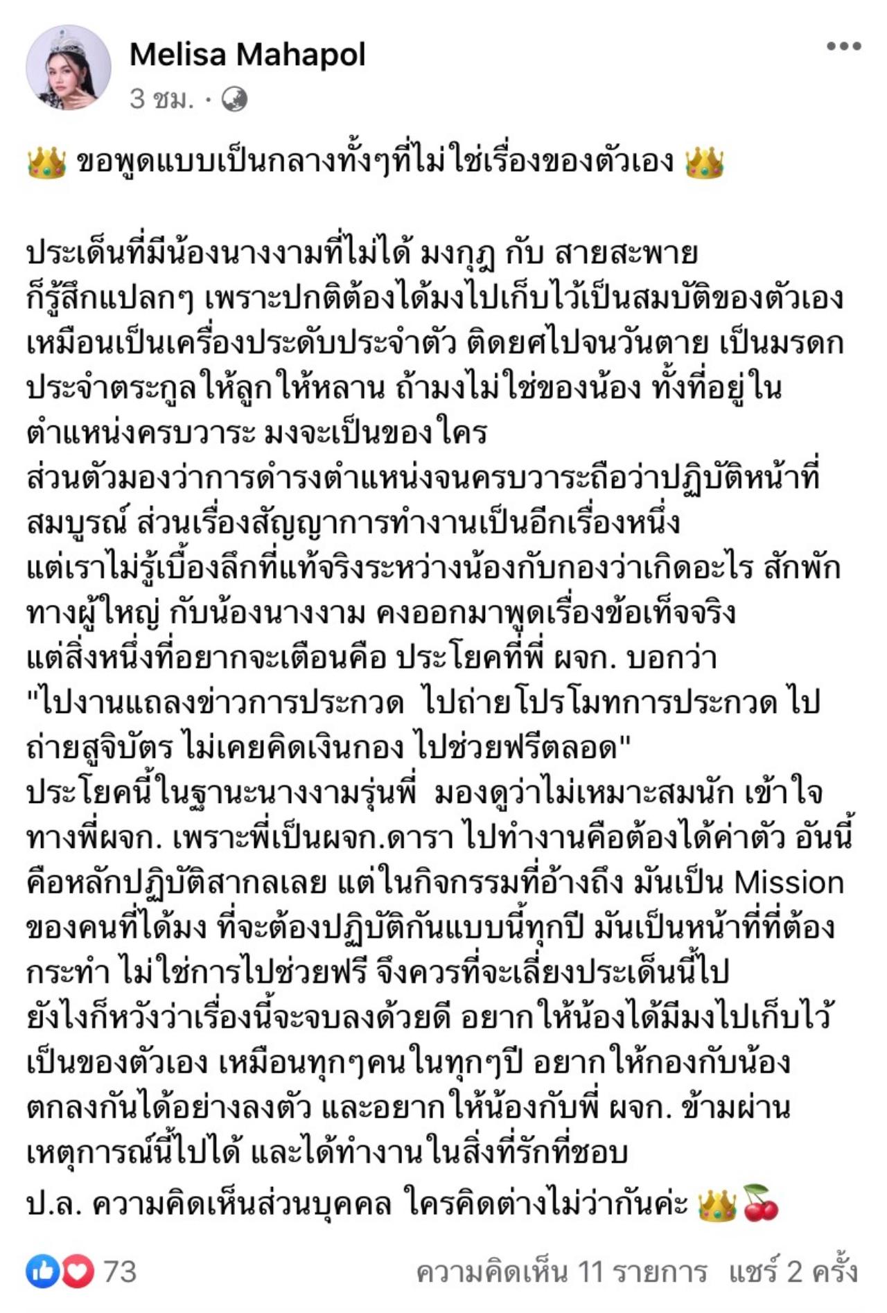 “ขอพูดแบบเป็นกลางทั้งๆ ที่ไม่ใช่เรื่องของตัวเอง ประเด็นที่มีน้องนางงามที่ไม่ได้ มงกุฎ กับ สายสะพาย ก็รู้สึกแปลกๆ เพราะปกติต้องได้มงไปเก็บไว้เป็นสมบัติของตัวเอง เหมือนเป็นเครื่องประดับประจำตัว ติดยศไปจนวันตาย เป็นมรดกประจำตระกูลให้ลูกให้หลาน