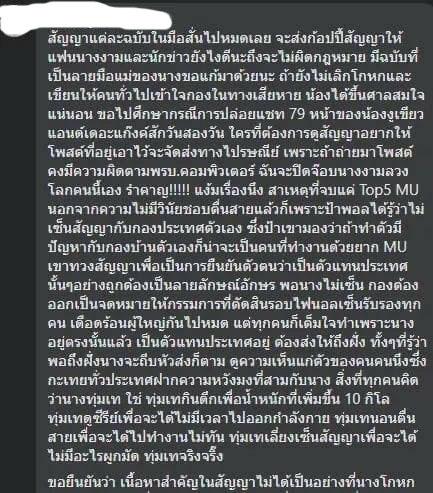 โดยบอกว่า “สัญญาแต่ละฉบับในมือสั่นไปหมดเลย จะส่งก๊อบปี้สัญญาให้แฟนนางงามและนักข่าวยังไงดีนะถึงจะไม่ผิดกฎหมาย มีฉบับที่เป็นลายมือแม่ของนางขอแก้มาด้วยนะ ถ้ายังไม่เลิกโกหกและเขียนให้คนทั่วไปเข้าใจกองในทางเสียหาย น้องได้ขึ้นศาลสมใจแน่นอน
