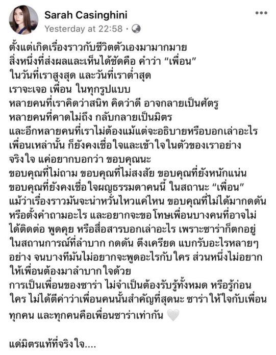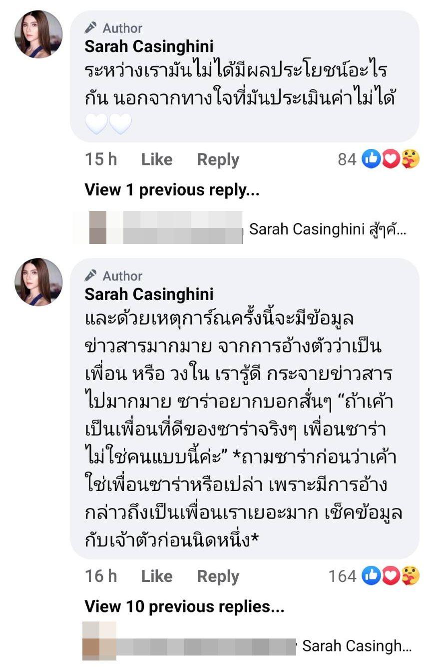 นอกจากนี้ ซาร่า ยังเขียนเพิ่มเติมเกี่ยวกับเรื่องเพื่อนในคอมเมนต์ว่า “ระหว่างเรามันไม่ได้มีผลประโยชน์อะไรกัน นอกจากทางใจที่มันประเมินค่าไม่ได้” และ “และด้วยเหตุการณ์ครั้งนี้จะมีข้อมูลข่าวสารมากมาย จากการอ้างตัวว่าเป็น เพื่อน หรือ วงใน เรารู้ดี กระจายข่าวสารไปมากมาย ซาร่าอยากบอกสั้นๆ “ถ้าเค้าเป็นเพื่อนที่ดีของซาร่าจริงๆ เพื่อนซาร่าไม่ใช่คนแบบนี้ค่ะ” *ถามซาร่าก่อนว่าเค้าใช่เพื่อนซาร่าหรือเปล่า เพราะมีการอ้างกล่าวถึงเป็นเพื่อนเราเยอะมาก เช็กข้อมูลกับเจ้าตัวก่อนนิดหนึ่ง*” โดยมีแฟนๆ กดไลค์และคอมเมนต์เป็นจำนวนมาก.