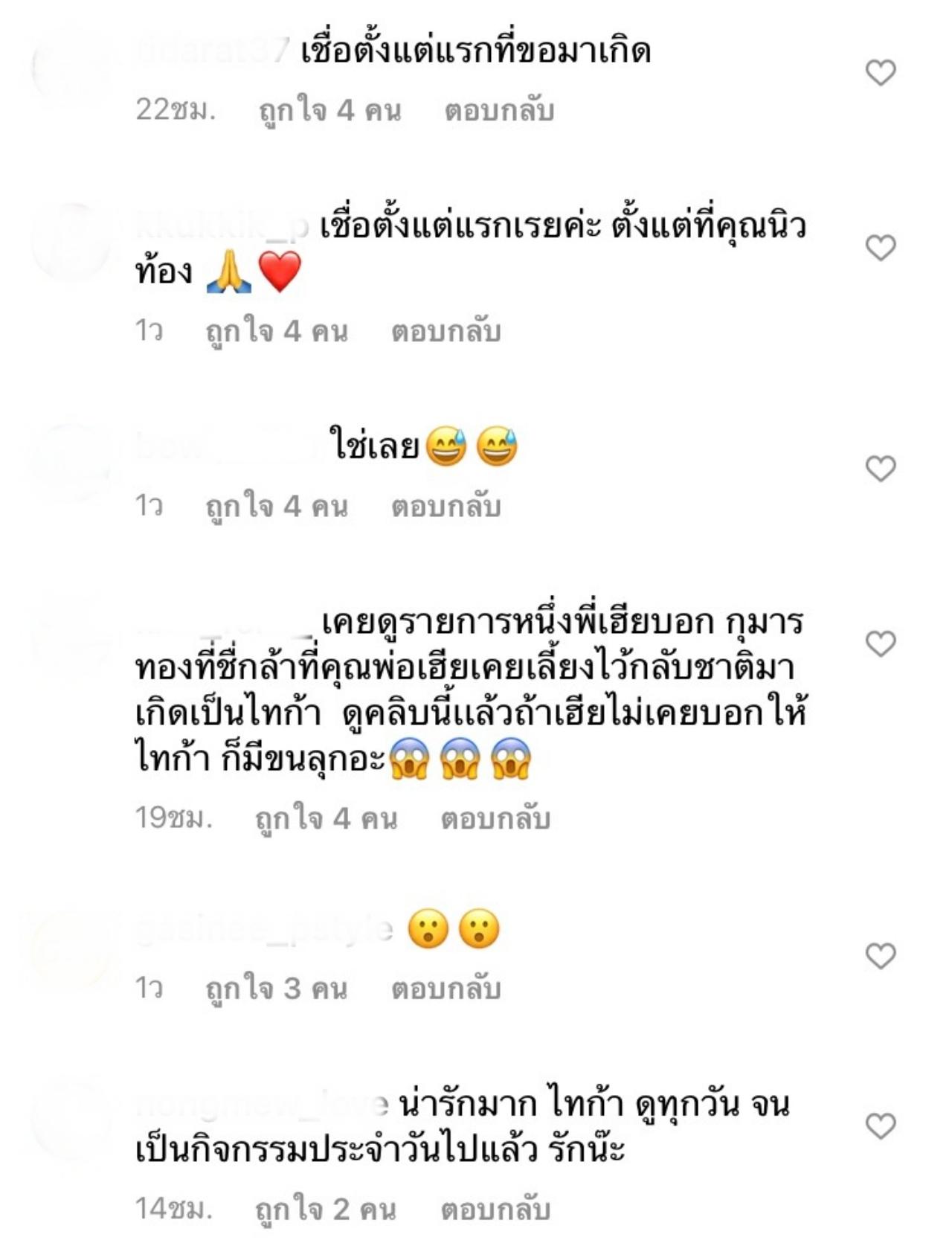 ซึ่งแฟนๆ ที่ติดตามต่างเข้ามาคอมเมนต์กันเป็นจำนวนมาก พร้อมกับช่วยกันส่องเลขบนตัวกุมารทองว่าเห็นเลข 67 ชัดมาก และบอกว่า เชื่อตั้งแต่ เพชรจ้า พูดเรื่องที่มาของชื่อน้องไทก้าแล้ว เค้ามาเกิดแล้วจริงๆ.