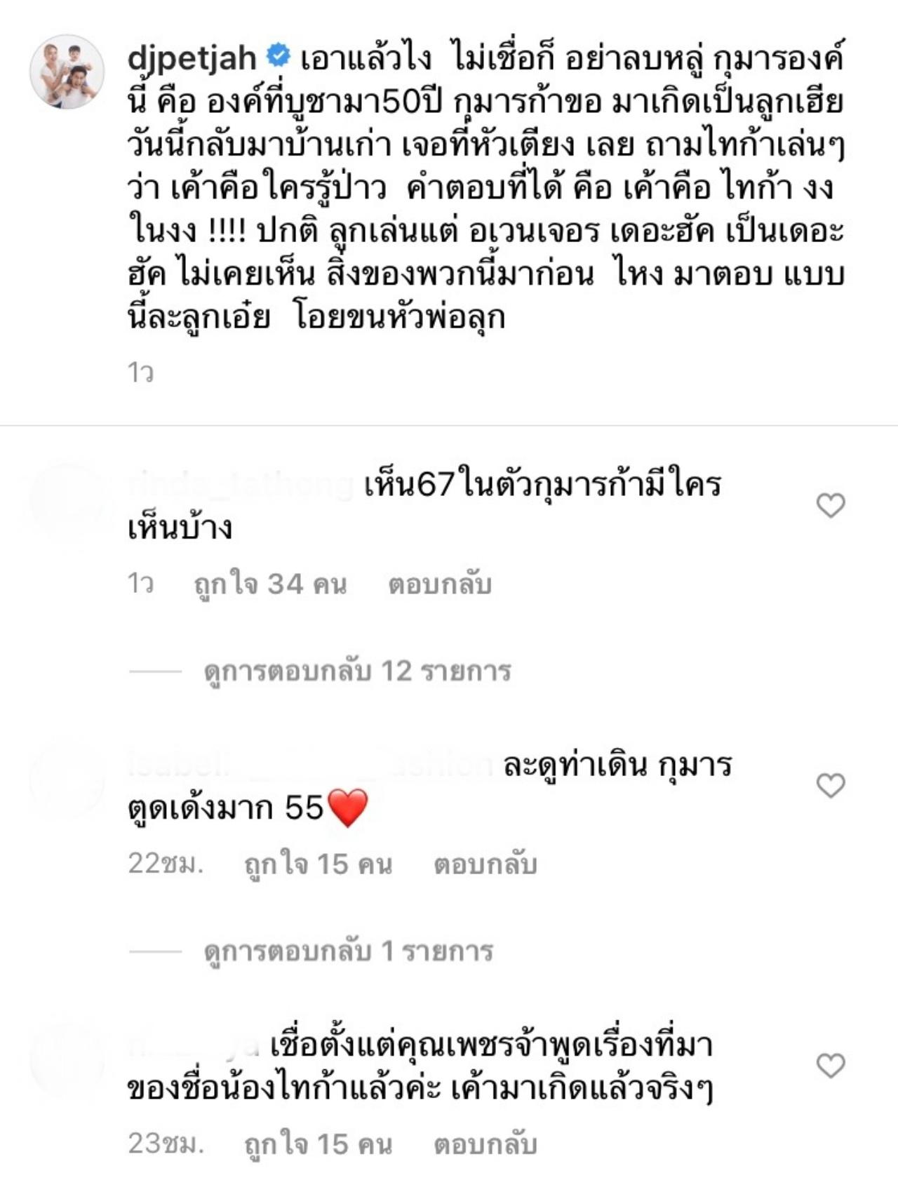 ล่าสุดในอินสตาแกรมของ เพชรจ้า ก็ได้โพสต์คลิปพร้อมกับเขียนเล่าเรื่องราวอันชวนขนลุกว่า "เอาแล้วไง ไม่เชื่อก็ อย่าลบหลู่ กุมารองค์นี้ คือ องค์ที่บูชามา 50 ปี กุมารก้าขอมาเกิดเป็นลูกเฮีย วันนี้กลับมาบ้านเก่า เจอที่หัวเตียง เลย ถามไทก้าเล่นๆ ว่า เค้าคือใครรู้ป่าว คำตอบที่ได้ คือ เค้าคือ ไทก้า งงในงง !!!! ปกติ ลูกเล่นแต่ อเวนเจอร์ เดอะฮัค เป็นเดอะฮัค ไม่เคยเห็น สิ่งของพวกนี้มาก่อน ไหง มาตอบ แบบนี้ละลูกเอ๋ย โอยขนหัวพ่อลุก"