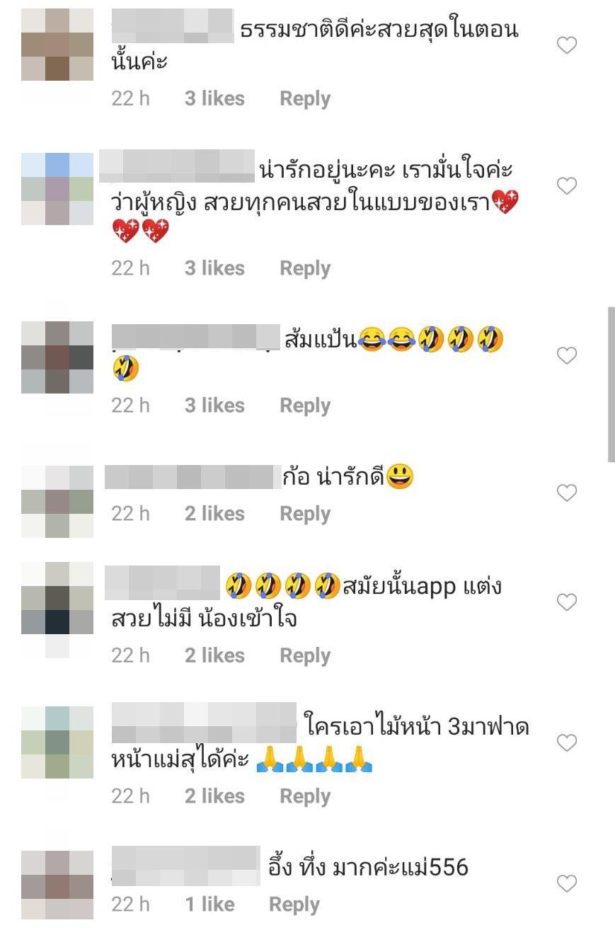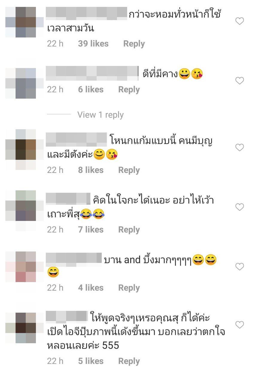 นอกจากนี้ยังมีแฟนๆ คอมเมนต์แซวอีกเพียบ อาทิ ให้พูดจริงๆเหรอคุณสุ ก็ได้ค่ะ เปิดไอจีปุ๊บภาพนี้เด้งขึ้นมา บอกเลยว่าตกใจ หลอนเลยค่ะ 555, บาน and บึ้งมากๆๆๆๆ, ธรรมชาติดีค่ะสวยสุดในตอนนั้นค่ะ, น่ารักอยู่นะคะ เรามั่นใจค่ะว่าผู้หญิงสวย ทุกคนสวยในแบบของเรา ฯลฯ.