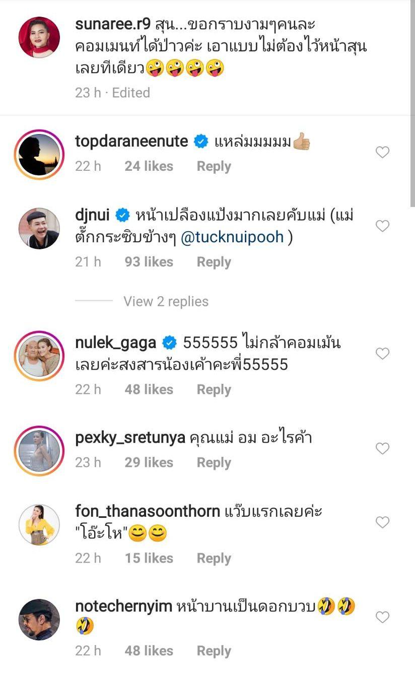 แน่นอนงานนี้คนในวงการบันเทิงแห่คอมเมนต์แซวรัวๆ หนักมาก อาทิ ดีเจนุ้ย ธนวัฒน์ “หน้าเปลืองแป้งมากเลยคับแม่ (แม่ตั๊กกระซิบข้างๆ @tucknuipooh)”, หนูเล็ก ก่อนบ่าย “555555 ไม่กล้าคอมเม้นเลยค่ะสงสารน้องเค้าคะพี่ 55555”, ท็อป ดารณีนุช “แหล่มมมมม” และใส่อีโมจิยกนิ้วโป้งให้, โน้ต เชิญยิ้ม “หน้าบานเป็นดอกบวบ”, เป็กกี้ ศรีธัญญา “คุณแม่ อม อะไรค้า”, ฝน ธนสุนทร “แว๊บแรกเลยค่ะ "โอ๊ะโห”” ฯลฯ