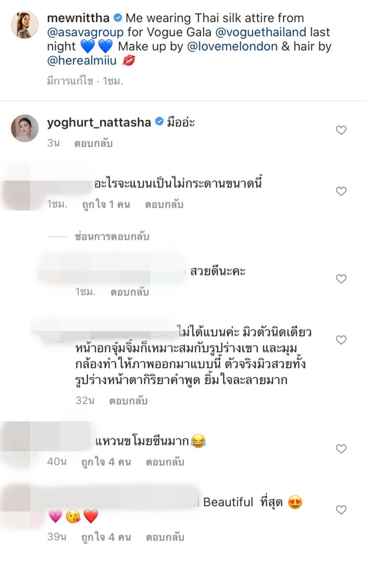 แต่งานนี้กลับมีชาวเน็ตรายหนึ่งเข้ามาคอมเมนต์ใต้รูปดังกล่าวของสาวมิวว่า “อะไรจะแบนเป็นไม้กระดานขนาดนี้” ซึ่งก็มีแฟนๆ ของสาวมิวเข้ามาตอบโต้ชาวเน็ตคนดังกล่าวว่า “สวยดีนะคะ” และ “ไม่ได้แบนค่ะ มิวตัวนิดเดียว หน้าอกจุ๋มจิ๋มก็เหมาะสมกับรูปร่างเขา และมุมกล้องทำให้ภาพออกมาแบบนี้ ตัวจริงมิวสวยทั้งรูปร่างหน้าตา กิริยาคำพูด ยิ้มใจละลายมาก”
