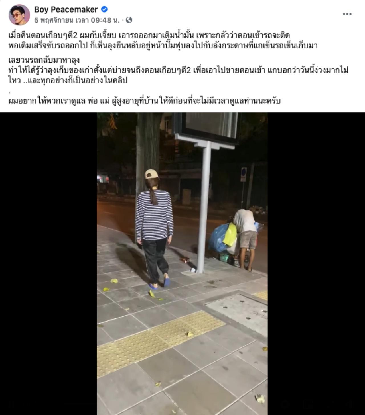 "เมื่อคืนตอนเกือบๆ ตี 2 ผมกับเจี๊ยบ เอารถออกมาเติมน้ำมั้น เพราะกลัวว่าตอนเช้ารถจะติด พอเติมเสร็จขับรถออกไป ก็เห็นลุงยืนหลับอยู่หน้าปั๊มฟุบลงไปกับลังกระดาษที่แกเข็นรถเข็นเก็บมา เลยวนรถกลับมาหาลุง ทำให้ได้รู้ว่าลุงเก็บของเก่าตั้งแต่บ่ายจนถึงตอนเกือบๆ ตี 2 เพื่อเอาไปขายตอนเช้า แกบอกว่าวันนี้ง่วงมากไม่ไหว ..และทุกอย่างก็เป็นอย่างในคลิป