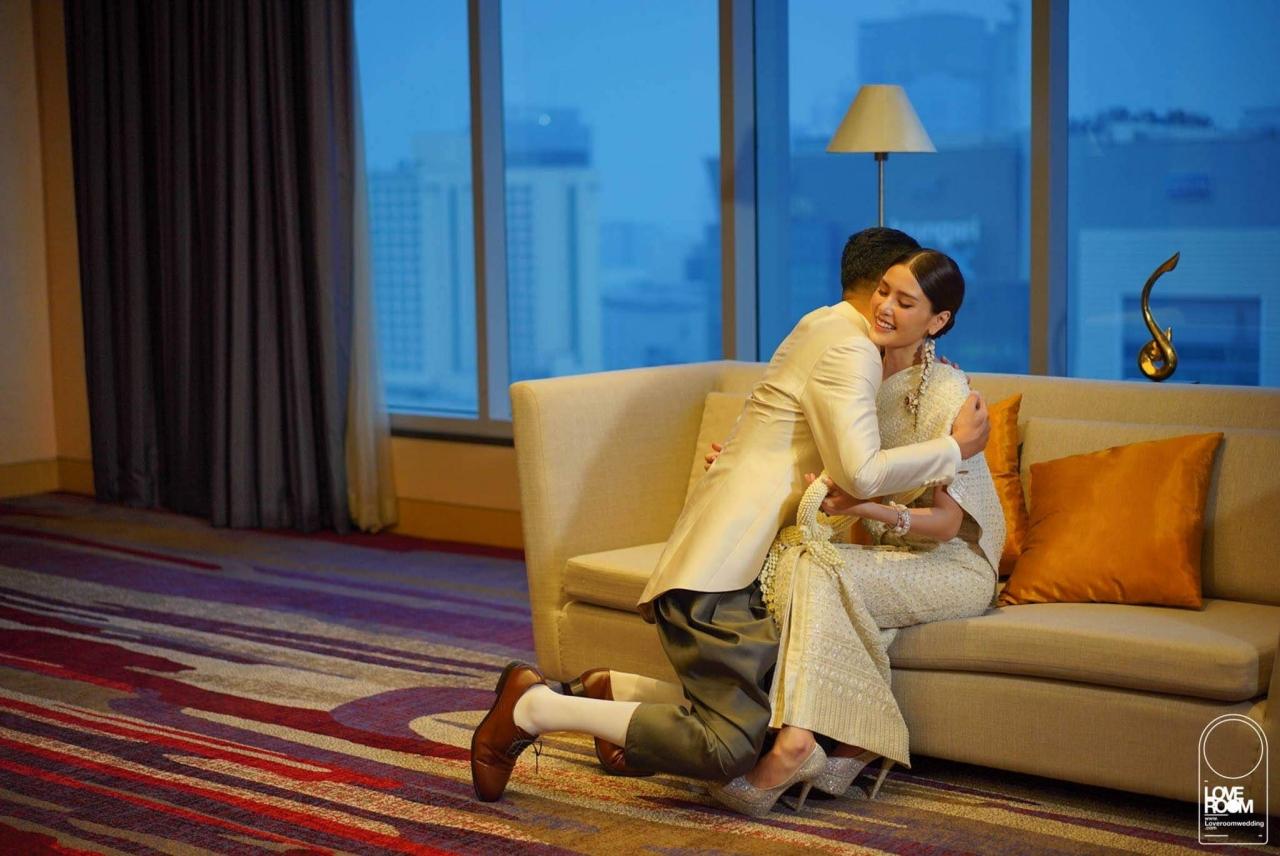 ซึ่งบรรยากาศในงานแต่งของทั้งคู่อบอวลไปด้วยความรักของคนทั้งสอง และแขกที่ต่างมาร่วมยินดีมากมาย พิธีขันหมากในช่วงเช้า เจ้าสาวเปิดตัวมาในลุคชุดไทยจักรพรรดิสีงาช้าง สุดงดงาม ตัดเย็บด้วยผ้าไหมลำพูน แต่งด้วยงานปักลวดลายดอกพิกุลแก้วทั้งผืน