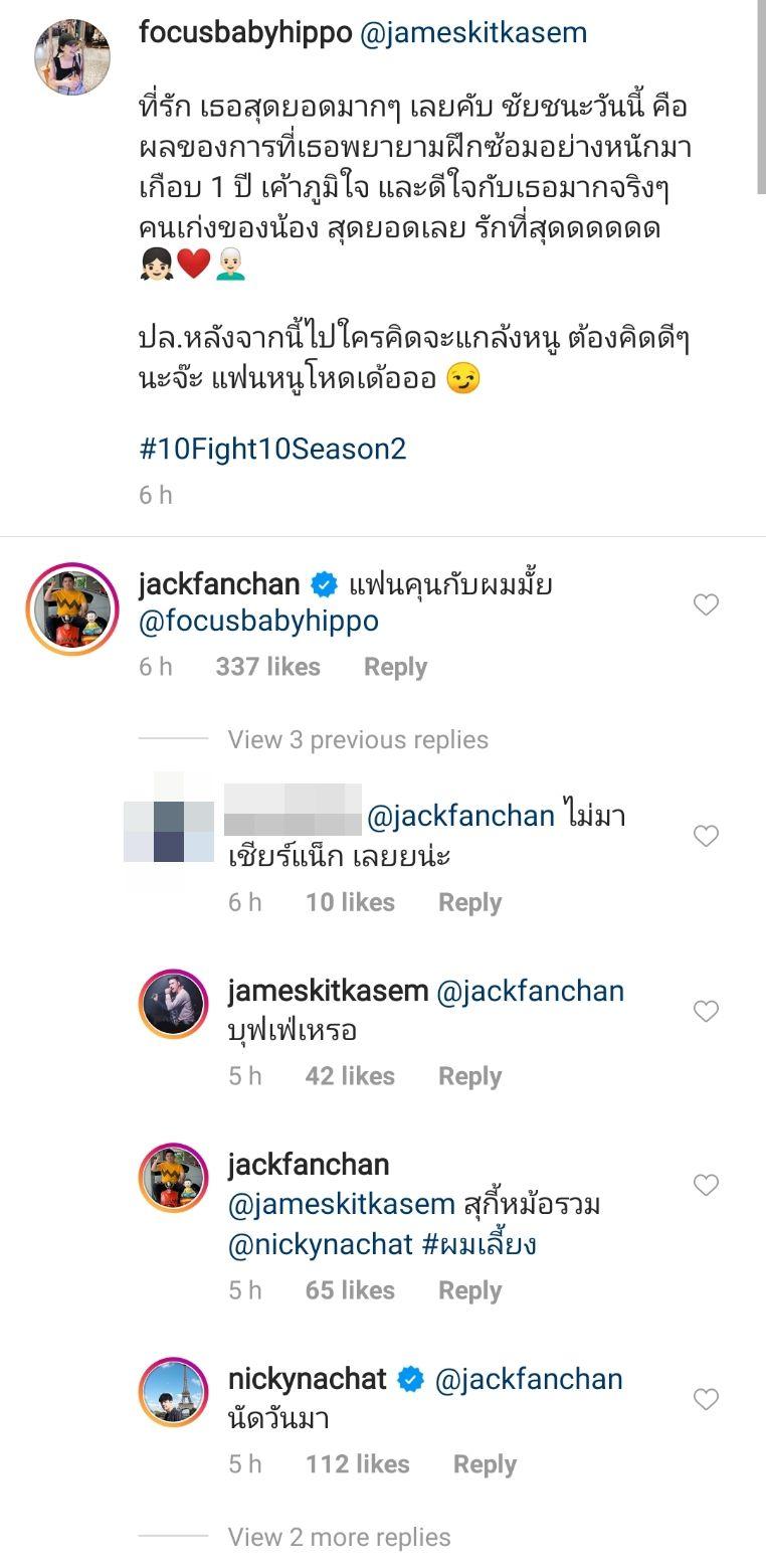 หลังจากที่โฟกัสโพสต์ไปก็มีแฟนๆ รวมถึงคนในวงการบันเทิงเข้ามาคอมเมนต์หลายคน รวมไปถึง แจ๊ค แฟนฉัน ที่เข้ามาคอมเมนต์ฮาๆ ว่า "แฟนคุณกับผมมั้ย" ก่อนที่เจมส์จะคอมเมนต์ตอบกลับว่า "บุฟเฟ่ต์เหรอ" และแจ๊คตอบกลับว่า "สุกี้หม้อรวม @nickynachat #ผมเลี้ยง" ด้านนิกกี้ ณฉัตร ที่ถูกแท็กถึงก็รีบตอบทันที "นัดวันมา" ทำเอาแฟนๆ แห่กดไลค์ยกใหญ่ จากโมเมนต์ซึ้งๆ ชมแฟนเรื่องซ้อมมวย กลายเป็นนัดเลี้ยงสุกี้หม้อรวมเฉยเลยจ้า.