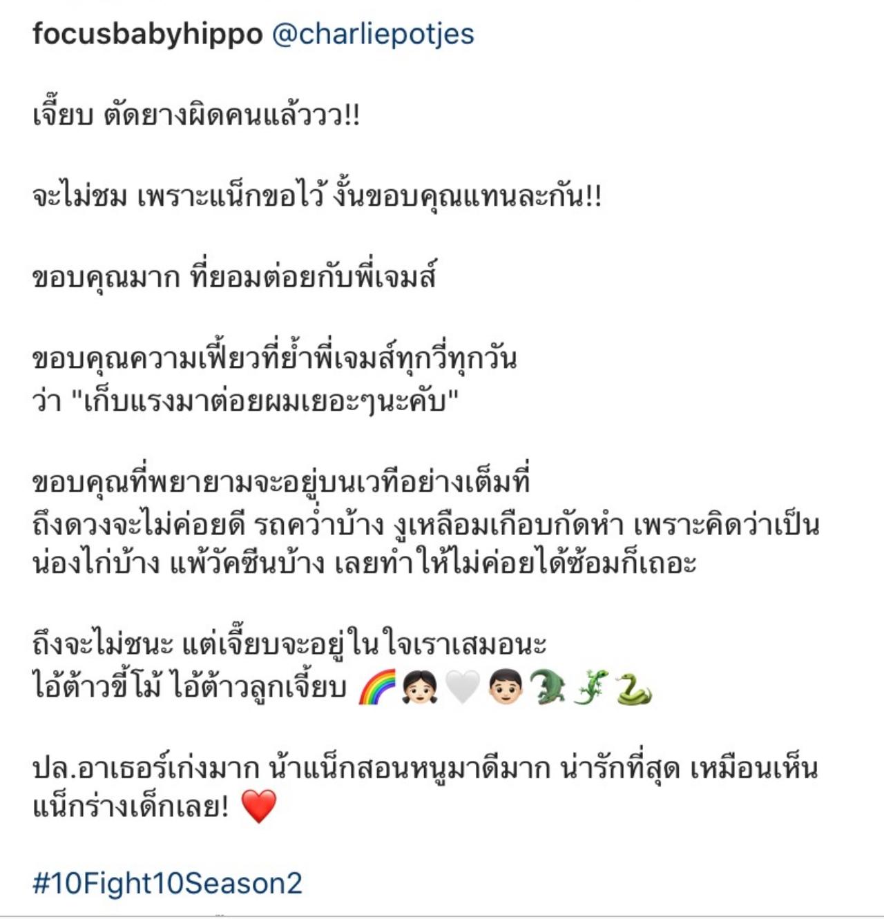 “เจี๊ยบ ตัดยางผิดคนแล้ววว!! จะไม่ชม เพราะแน็กขอไว้ งั้นขอบคุณแทนละกัน!! ขอบคุณมาก ที่ยอมต่อยกับพี่เจมส์ ขอบคุณความเฟี้ยวที่ย้ำพี่เจมส์ทุกวี่ทุกวัน ว่า "เก็บแรงมาต่อยผมเยอะๆนะคับ"