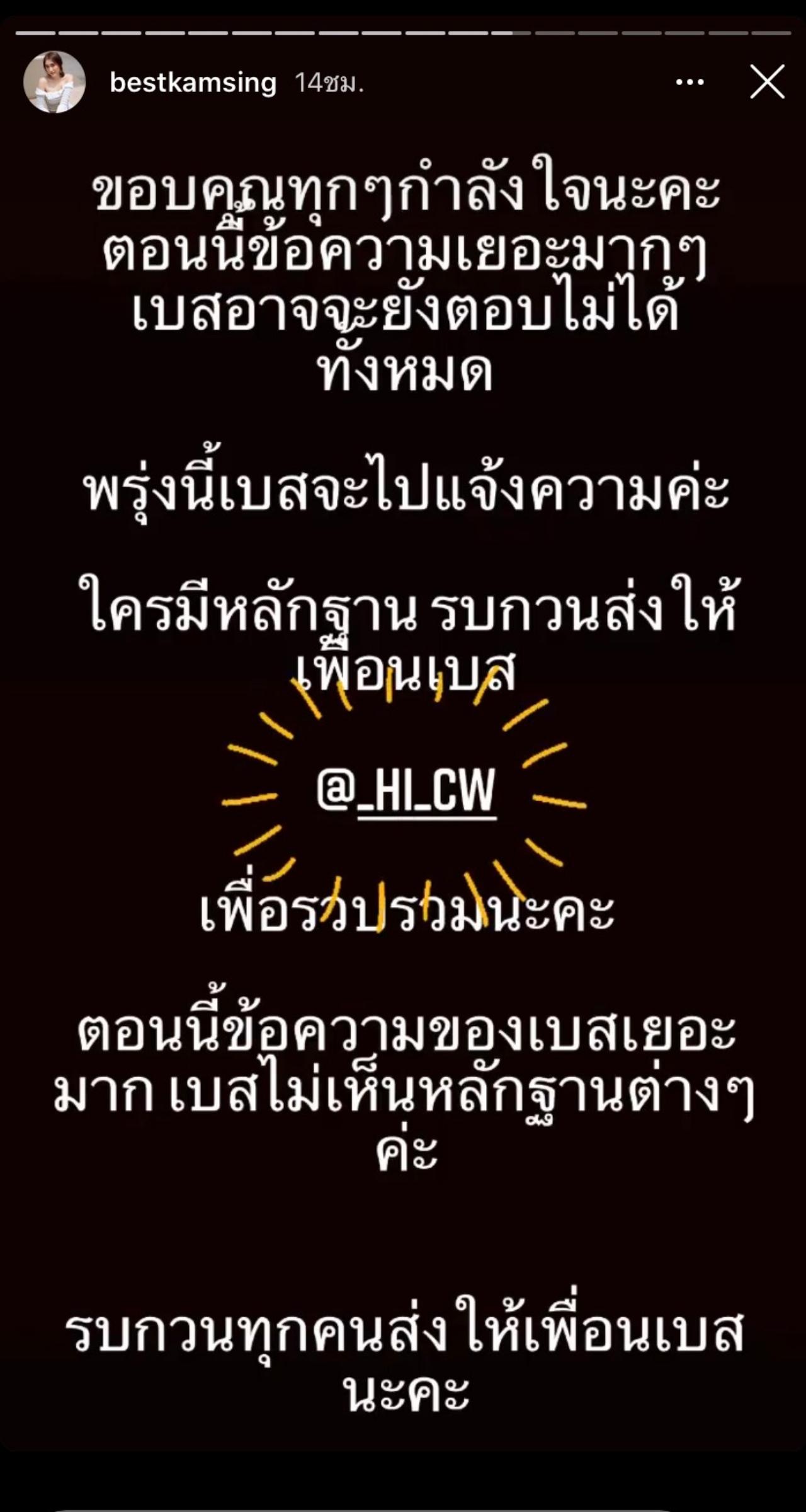 “ไม่ใช่เบสนะคะ แค่ชุดมหาลัยก็ไม่ใช่แล้วค่ะ ใครลงหรือแชร์อะไรที่ทำให้เบสเสียหาย พรุ่งนี้เจอกันค่ะ” และ “ขอบคุณทุกๆ กำลังใจนะคะ ตอนนี้ข้อความเยอะมากๆ เบสอาจจะยังตอบไม่ได้ทั้งหมด พรุ่งนี้เบสจะไปแจ้งความค่ะ ใครมีหลักฐานรบกวนส่งให้เพื่อนเบส เพื่อรวบรวมนะคะ ตอนนี้ข้อความของเพจเยอะมาก เบสไม่เห็นหลักฐานต่างๆ ค่ะ รบกวนทุกคนส่งให้เพื่อนเบสนะคะ”