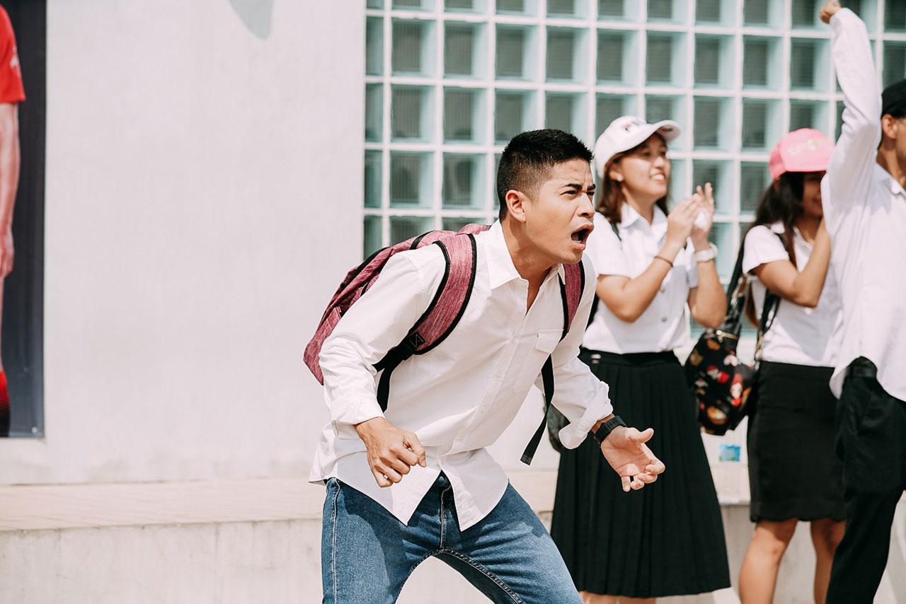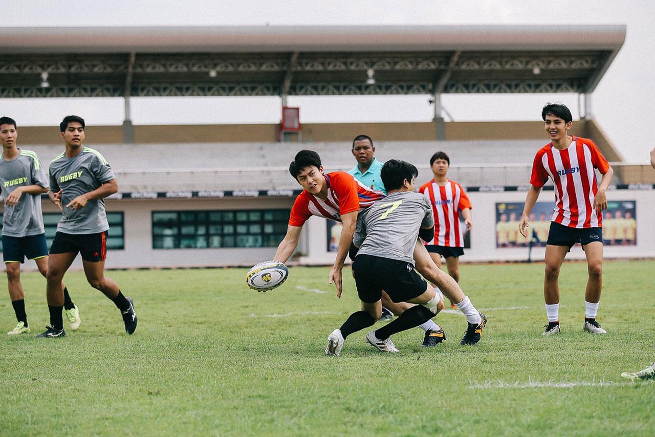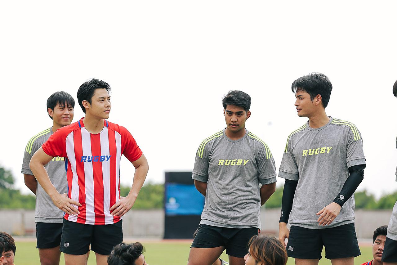 ก่อนถ่ายจริงทั้ง หมาก-ปั้นจั่น ชิงออกตัวก่อนเลย “สารภาพว่าไม่ใช่สายรักบี้ แต่ก่อนวันถ่าย พี่ชุจัดวันซ้อมให้นักกีฬารักบี้จริงๆ มาช่วยสอน ช่วยเทรน และซ้อมแข่งกันจริงไปก่อนหน้านี้ คิดว่าวันนี้น่าจะเอาอยู่(555)” ซึ่งพอเอาจริง ทั้งคู่เอาอยู่มาก..กก เปิดสนามฟาดกันรัวๆ วิ่งจริง เล่นจริง ล้มจริง แข่งกันดุเดือด เรียกว่าอะดรีนาลินพุ่ง เหงื่อไหลทะลักเป็นน้ำ โดยเฉพาะซีนปะทะกระแทกใส่กัน เล่นแรงล้มลุกคลุกคลานตีลังกากันไปหลายรอบ อื้อหือ..แค่เห็นยังเจ็บแทน แต่ 2 หนุ่มไม่มีบ่น ยิ่งแข่งเอเนอร์จี้ยิ่งแรง เล่นกันมันหยด อินเนอร์นักรักบี้มาเต็ม ไม่มีพลังตก ยิ่งฟรอยด์กับหลิงหลิงแท็กทีมทีมงานกองละครที่ปาวรณาร่วมเป็นกองหนุนออกเสียงเชียร์ส่งกรี๊ดรัวๆ ข้างสนาม นักกีฬาก็ยิ่งฮึกเหิม คึกคักสุดๆ ลุ้นเหมือนดูการแข่งรักบี้จริงๆ หลังถ่ายเสร็จทั้งหมากทั้งปั้นจั่นได้แผลไปตามๆ กัน แต่ทั้งคู่กลับบอกเฉย “เหนื่อยสุด เล่นจริง แล้วก็เจ็บจริง แต่สนุกมากกก เหมือนได้ปลดปล่อยตัวเอง ฟีลมันได้ เหมือนเราสองคนกำลังแข่งกีฬารักบี้จริงๆ”
