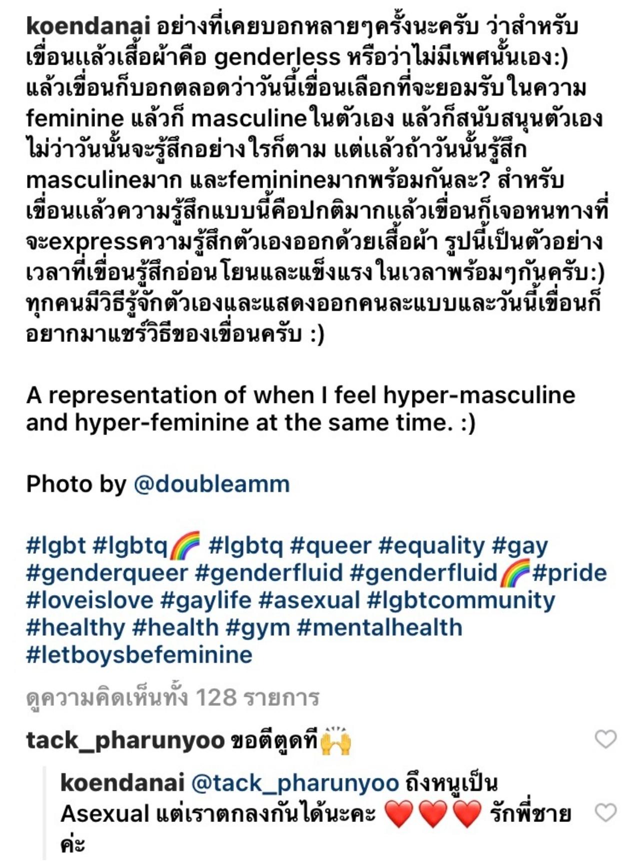 "อย่างที่เคยบอกหลายๆ ครั้งนะครับ ว่าสำหรับเขื่อนเเล้วเสื้อผ้าคือ genderless หรือว่าไม่มีเพศนั่นเอง:) แล้วเขื่อนก็บอกตลอดว่าวันนี้เขื่อนเลือกที่จะยอมรับในความ feminine แล้วก็ masculine ในตัวเอง แล้วก็สนับสนุนตัวเองไม่ว่าวันนั้นจะรู้สึกอย่างใรก็ตาม เเต่เเล้วถ้าวันนั้นรู้สึก masculine มาก และ feminine มากพร้อมกันล่ะ?