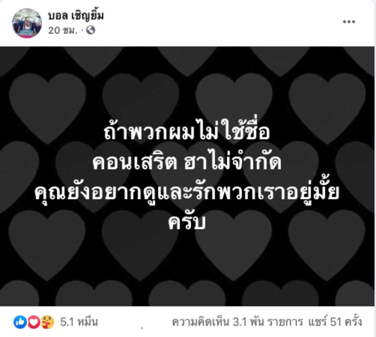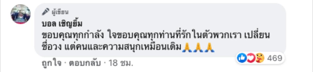 ซึ่งแฟนๆ ที่ติดตามต่างก็เข้ามาคอมเมนต์ถามว่าเกิดอะไรขึ้น อยากให้ บอล ช่วยอธิบายหน่อย และบางส่วนก็บอกว่า ถึงชื่อจะเปลี่ยนไป แต่ก็ยังติดตามและให้กำลังใจเหมือนเดิม.