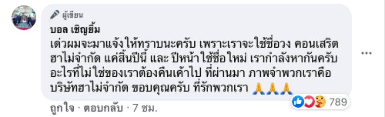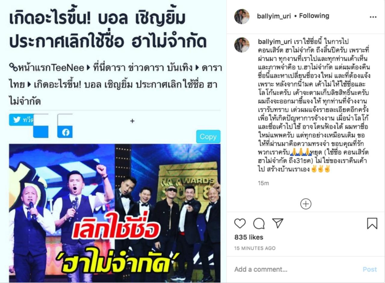 และ บอล ได้เขียนอธิบายในคอมเมนต์ว่า "เด่วผมจะมาแจ้งให้ทราบนะครับ เพราะเราจะใช้ชื่อวง คอนเสิร์ตฮาไม่จำกัด แค่สิ้นปีนี้ และ ปีหน้าใช้ชื่อใหม่ เรากำลังหากันครับ อะไรที่ไม่ใช่ของเราต้องคืนเค้าไป ที่ผ่านมา ภาพจำพวกเราคือ บริษัทฮาไม่จำกัด ขอบคุณครับ ที่รักพวกเรา"