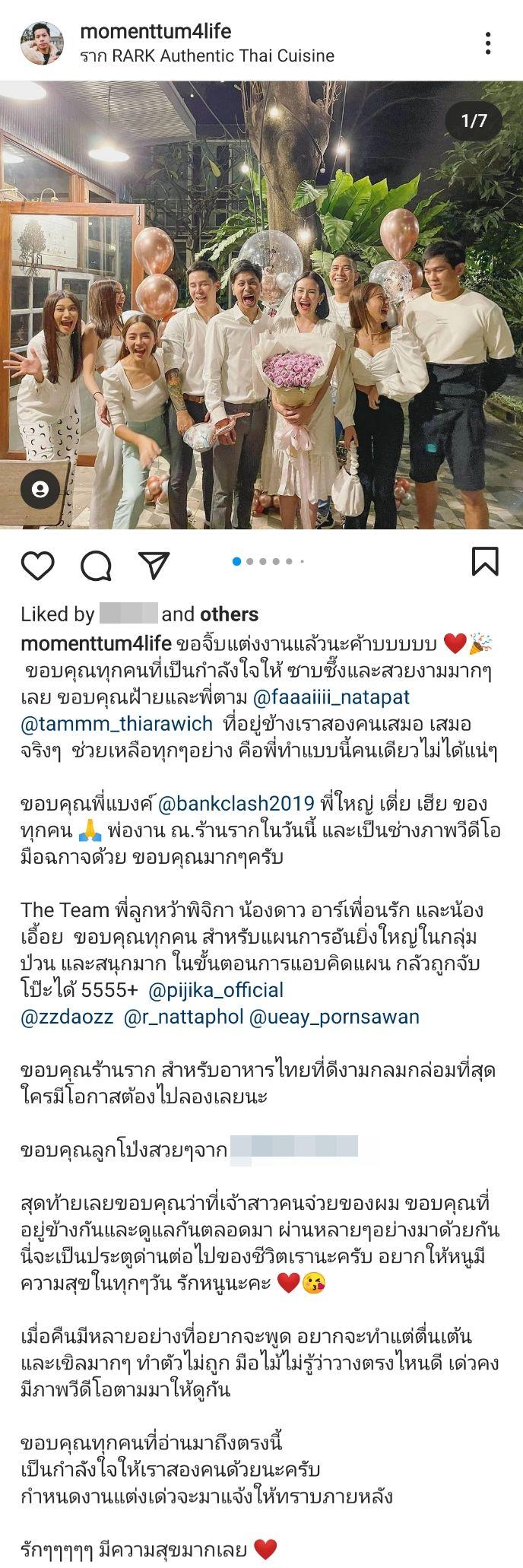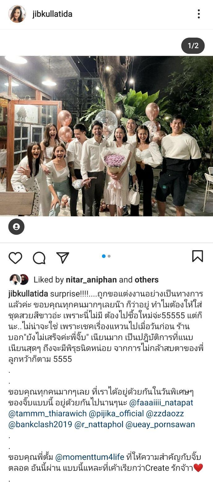 โดย ตั้ม ปรัชญา แฟนหนุ่มของจิ๊บ ได้โพสต์ภาพขอแต่งงาน บรรยากาศเต็มเปี่ยมไปด้วยความสุข พร้อมทั้งเขียนข้อความว่า “ขอจิ๊บแต่งงานแล้วนะค้าบบบบบ ขอบคุณทุกคนที่เป็นกำลังใจให้ ซาบซึ้งและสวยงามมากๆเลย ขอบคุณฝ้ายและพี่ตาม @faaaiiii_natapat @tammm_thiarawich ที่อยู่ข้างเราสองคนเสมอ เสมอจริงๆ ช่วยเหลือทุกๆ อย่าง คือพี่ทำแบบนี้คนเดียวไม่ได้แน่ๆ