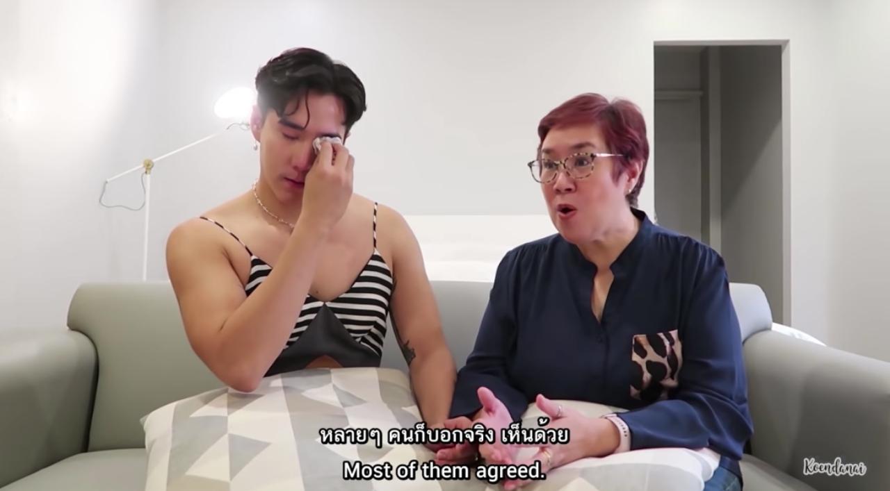 ซึ่งในระหว่างที่แม่เล่านั้น เขื่อนก็เข้าไปโอบกอดแม่พร้อมกับร้องไห้ และแม่ก็เล่าต่อว่า “มีหลายครอบครัวมากที่บางคนเกิดความขัดแย้งในใจ ไม่เข้าใจในสิ่งที่ลูกเป็น แต่แม่ไม่มีปัญหานั้น พอยิ่งสื่อสารกันมากเท่าไหร่ ยิ่งค้นพบลงไปเท่าไหร่ เราก็ยิ่งรู้ว่าการเปิดใจยอมรับมันเป็นกุญแจดอกสำคัญของทุกสิ่งเลย กลายเป็นว่าได้เห็นคนที่เรารักมีความสุข ได้เห็นในสิ่งที่เขาอยากทำแค่นั้นเอง”.