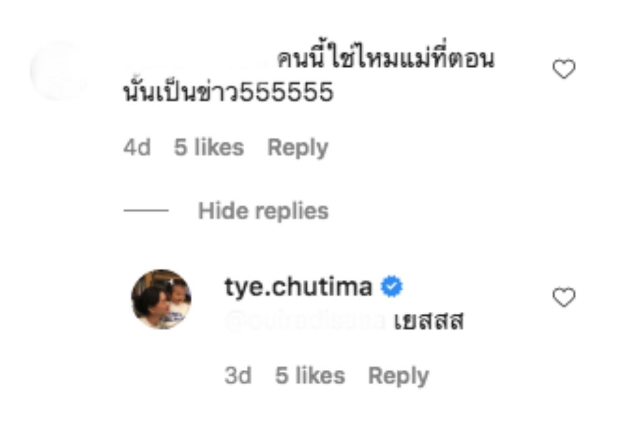 และยังได้มีคนเข้ามาถาม ต่าย อีกว่า "คนนี้ใช่ไหมแม่ที่ตอนนั้นเป็นข่าว555555" และ ต่าย ก็เข้ามาตอบว่า "เยสสส".