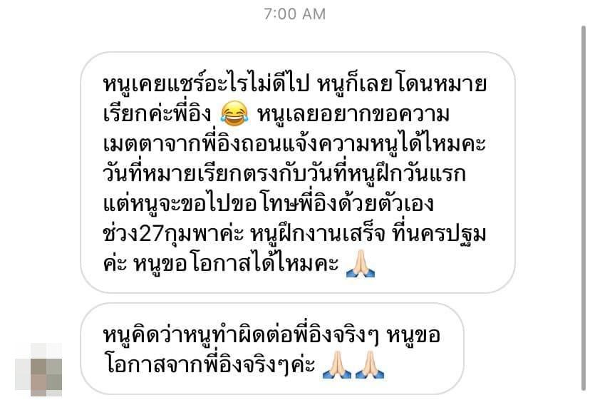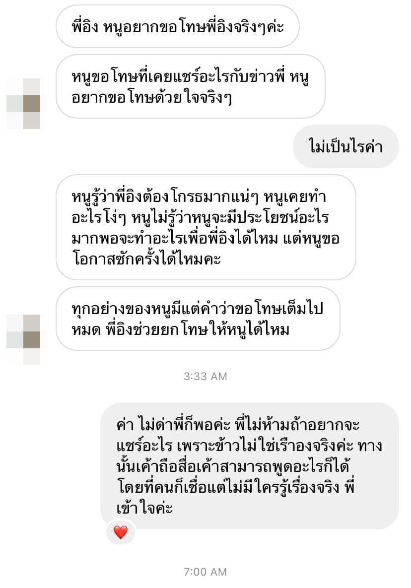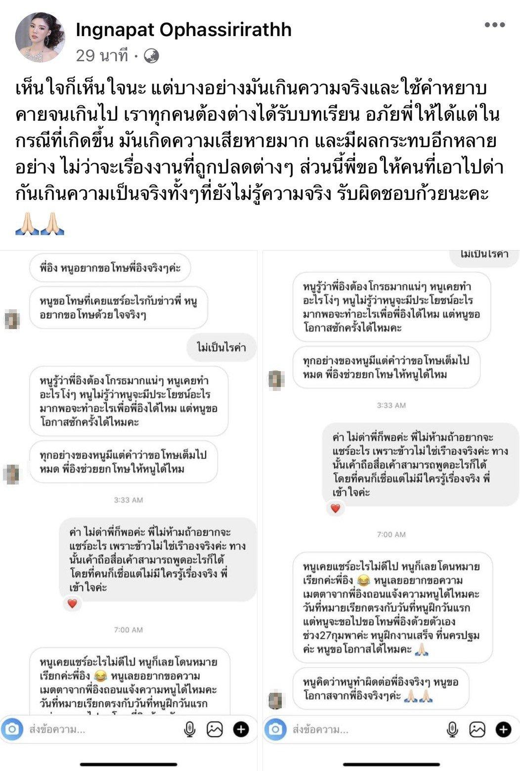 ซึ่งในภาพไดเร็กไอจีดังกล่าว คู่กรณีได้ขอโทษกับเรื่องที่เกิดขึ้นหลังโดนหมายเรียก พร้อมทั้งขอร้องให้อิงอิงถอนแจ้งความ อิงอิงก็ได้ตอบกลับคนที่ส่งข้อความไปว่า “ไม่ด่าพี่ก็พอ พี่ไม่ห้ามถ้าอยากจะแชร์อะไร เพราะ ข่าวไม่ใช่เรื่องจริง ทางนั้นเขาถือสื่อเขาสามารถพูดอะไรก็ได้ โดยคนก็เชื่อแต่ไม่มีใครรู้เรื่องจริง พี่เข้าใจค่ะ”.